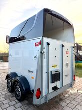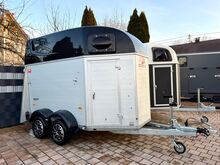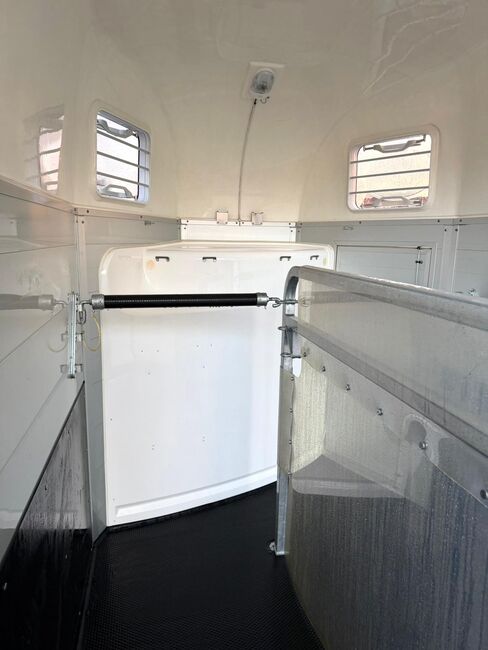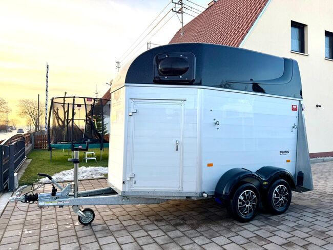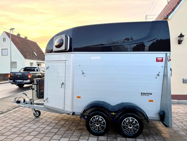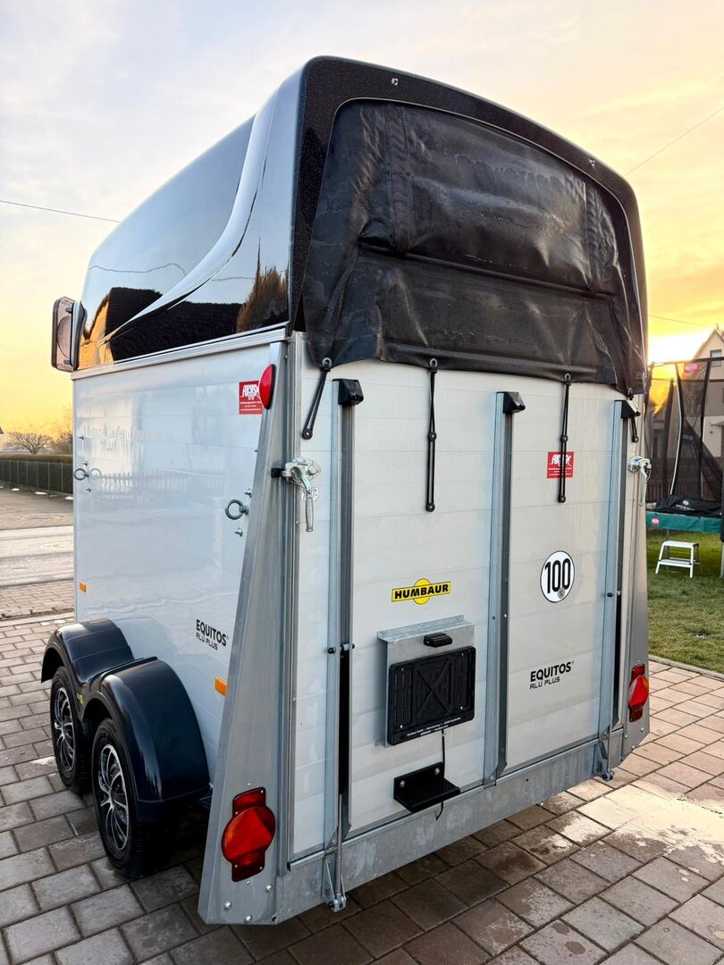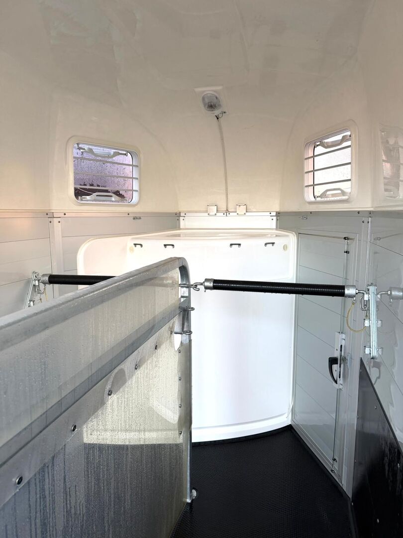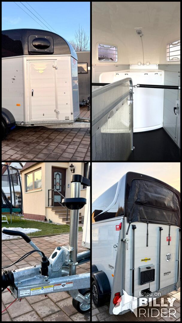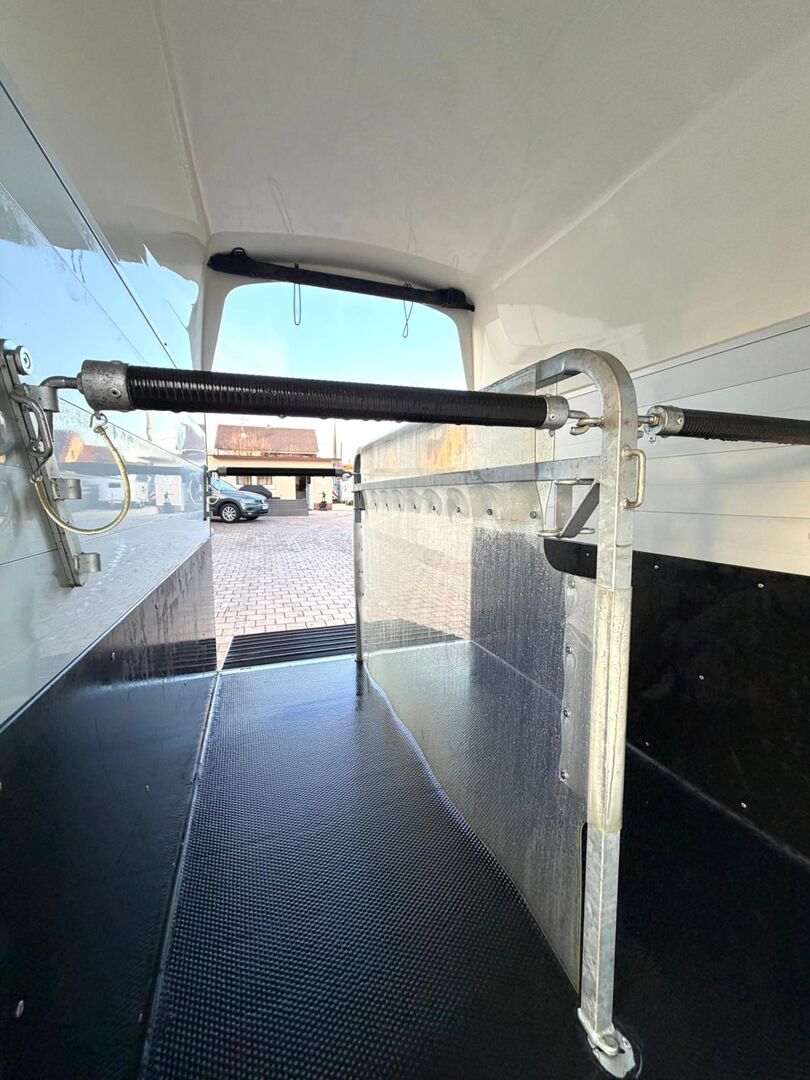 - First registration 07/2023 - Unladen weight approx. 887 kg - Permissible total weight 2000 kg - Max. drawbar load 100 kg - HU until August 2027 - EquiDrive chassis with shock absorber for 100 km/h approval - Automatic jockey wheel - Adjustable tinted windows - Panic system - Loading aid - Net roller blind - Lockable tack room - AluBiComp floor - Rubber floor glued and sealed - Hay net holder - Interior lighting - Holders for feed and water buckets - Step protection - PVC partition wall completely removable with adjustable swivel bar - Front and rear pony balancing