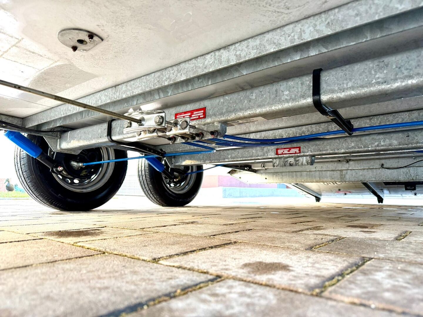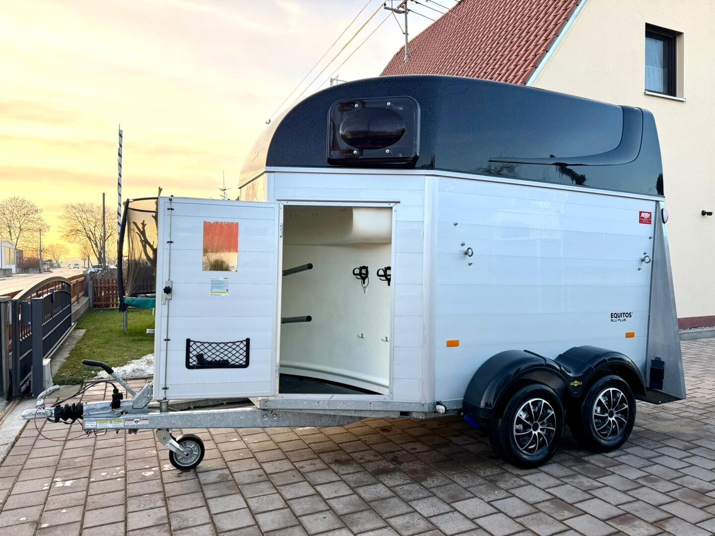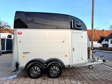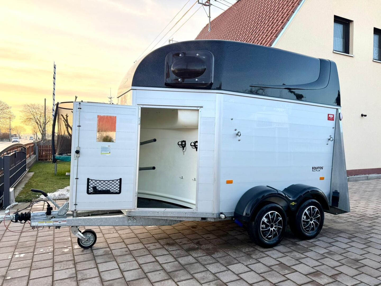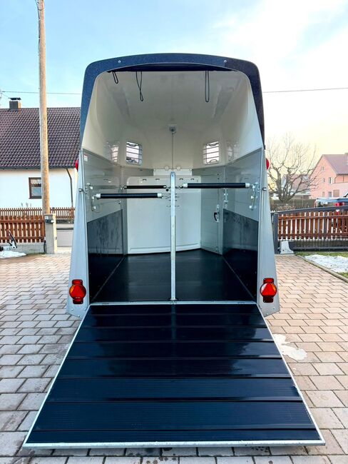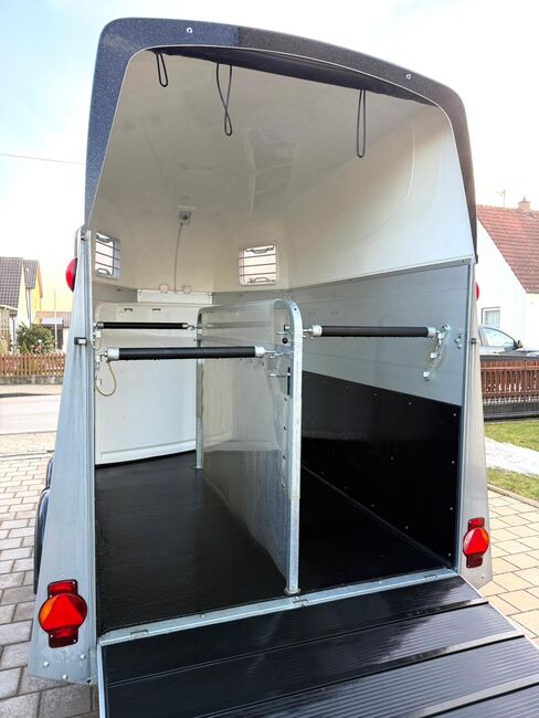 - First registration 07/2023 - Unladen weight approx. 887 kg - Permissible total weight 2000 kg - Max. drawbar load 100 kg - HU until August 2027 - EquiDrive chassis with shock absorber for 100 km/h approval - Automatic jockey wheel - Adjustable tinted windows - Panic system - Loading aid - Net roller blind - Lockable tack room - AluBiComp floor - Rubber floor glued and sealed - Hay net holder - Interior lighting - Holders for feed and water buckets - Step protection - PVC partition wall completely removable with adjustable swivel bar - Front and rear pony balancing