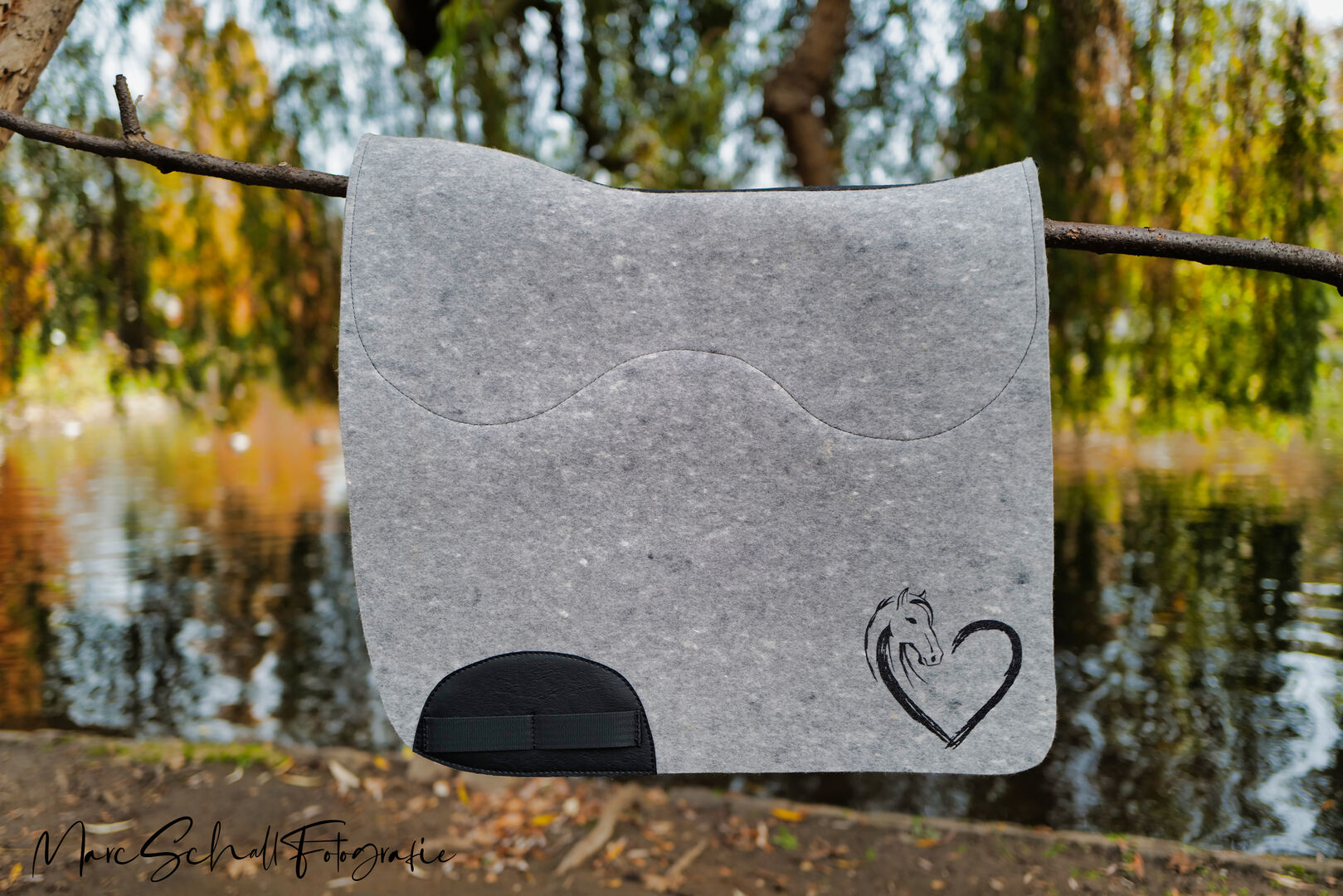 100% wool felt saddle pad ❤️ Felt saddle blanket ❤️ Wool felt saddle pad ❤️ - This saddle pad is made of 100% wool felt, 5 mm thick, in grey mottled. The saddle pad is doubled to 10 mm wool felt. The girth passage is reinforced with robust leather in black. Marlene has also chosen her motif in black glitter. Dreamlike beautiful