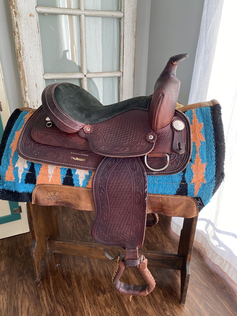 This Timber Ridge Saddlery western saddle is in good, pre-owned condition. Made in the U.S.A. This saddle’s combination of Aztec and basketweave leather tooling is stunning! Some normal wear from use; please review photos.
