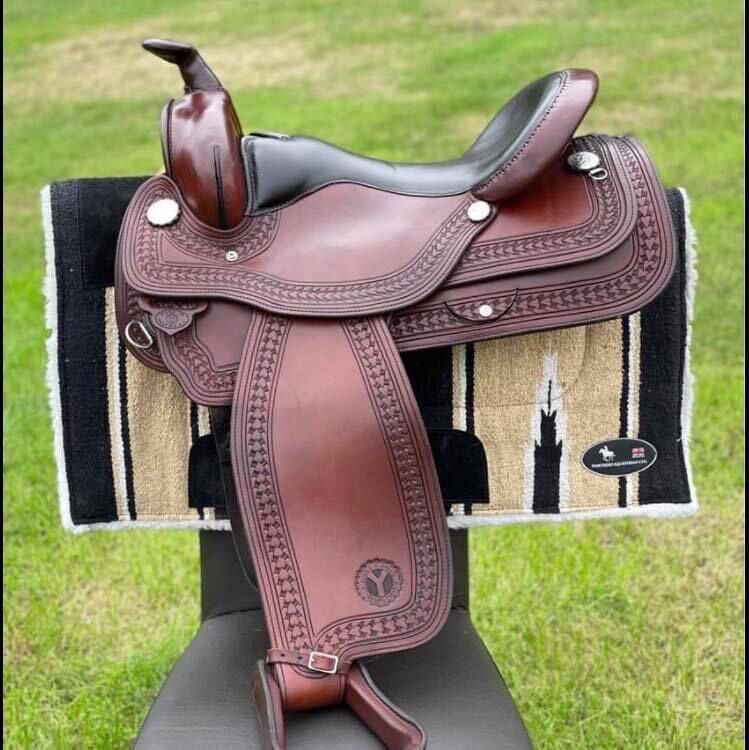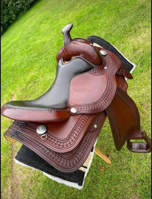 Wunderschöner 16” Westernsattel, bereit für Ausritte oder den Reitplatz! Dieser Sattel besticht durch hochwertiges, dunkelbraunes Leder mit aufwendiger Punzierung, die ihn zu einem echten Blickfang macht. Der Sitz ist bequem und gut gepolstert, ideal auch für längere Ritte.