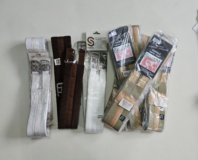 22 pieces girths package remaining stock - Girths in various sizes, colors and designs, many still in their original packaging.