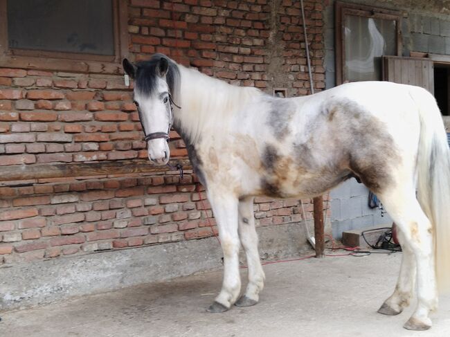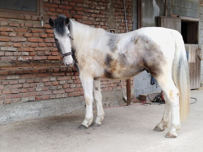 3.5 year old gelding by Waterman - Dam Lipizzaner mix, sire Waterman, porcelain pinto, 3.5 years old, height approx. 160 cm, baroque type. Not a horse for children or beginners. Raw.
