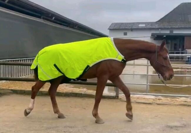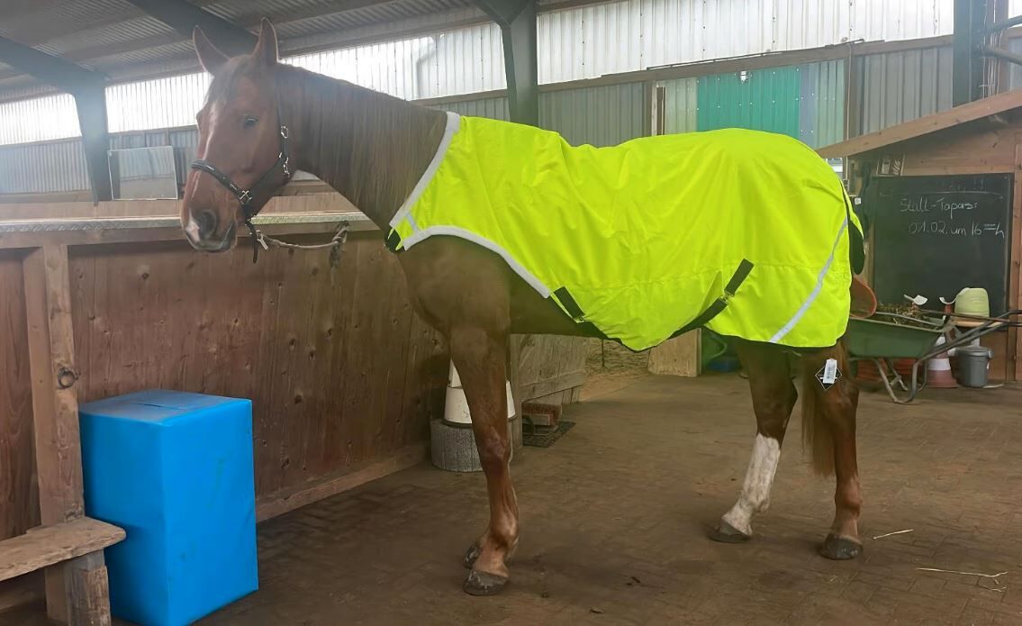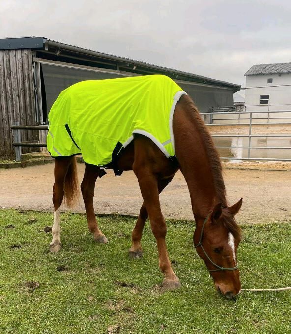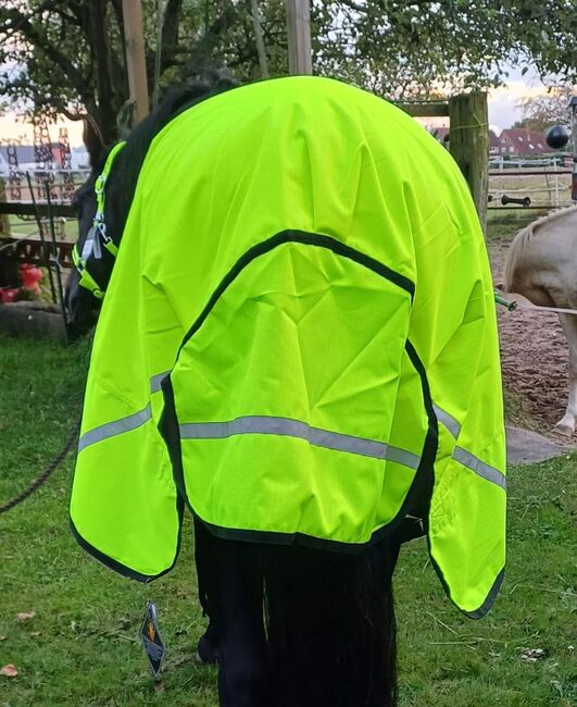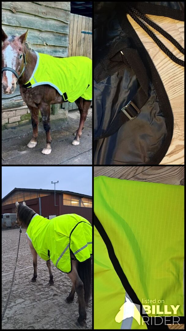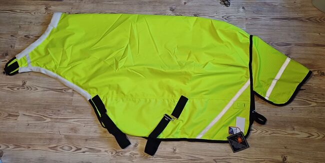 600D Ripstop Epoch special outer rug fabric 3000mm water column fluoro yellow with reflective stripes, very breathable according to the manufacturer from -20° to + 45° (see label), fleece padding on withers, neck and shoulder pads, taped seams, 100% windproof, 100% breathable, 100% waterproof, 100g in the back area, fur-friendly taffeta lining on the underside T-breast fastener with rubber ring to prevent accidental opening, Cross surcingles with rubber ring to prevent unintentional opening, deep-seated tail flap, upper tail cord, lower strap with carabiner prevents the blanket from folding up when rolling, with zipper pocket