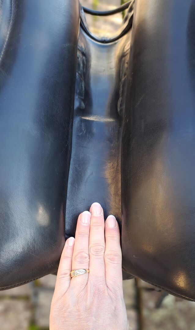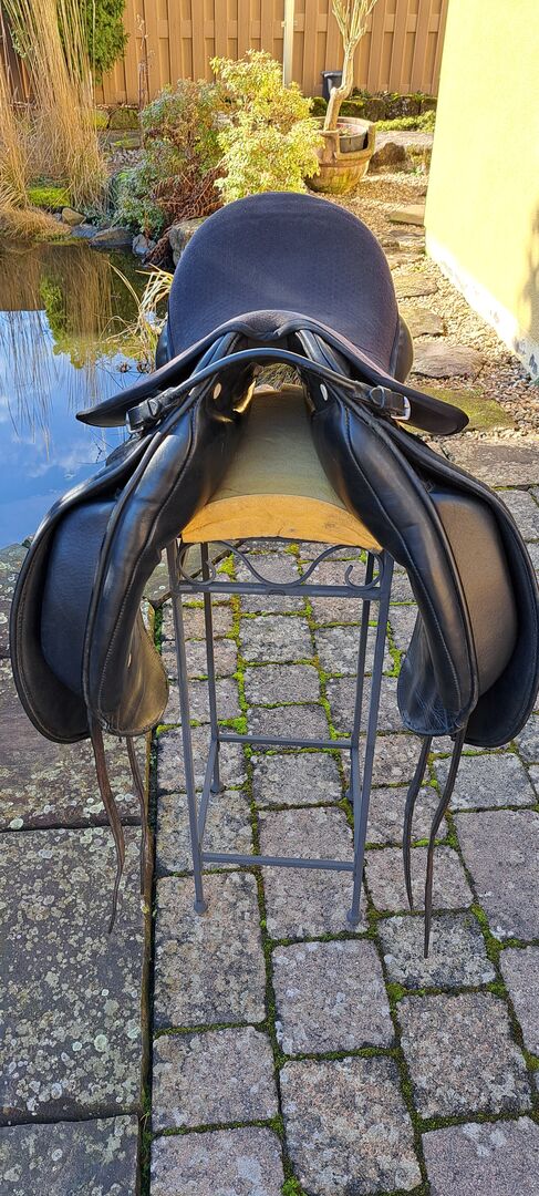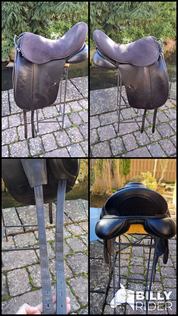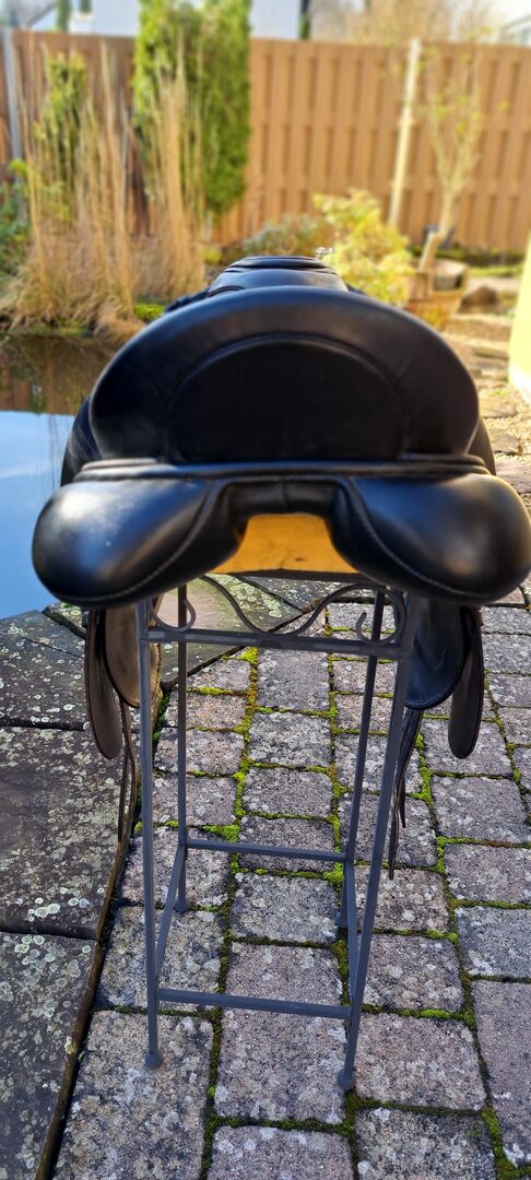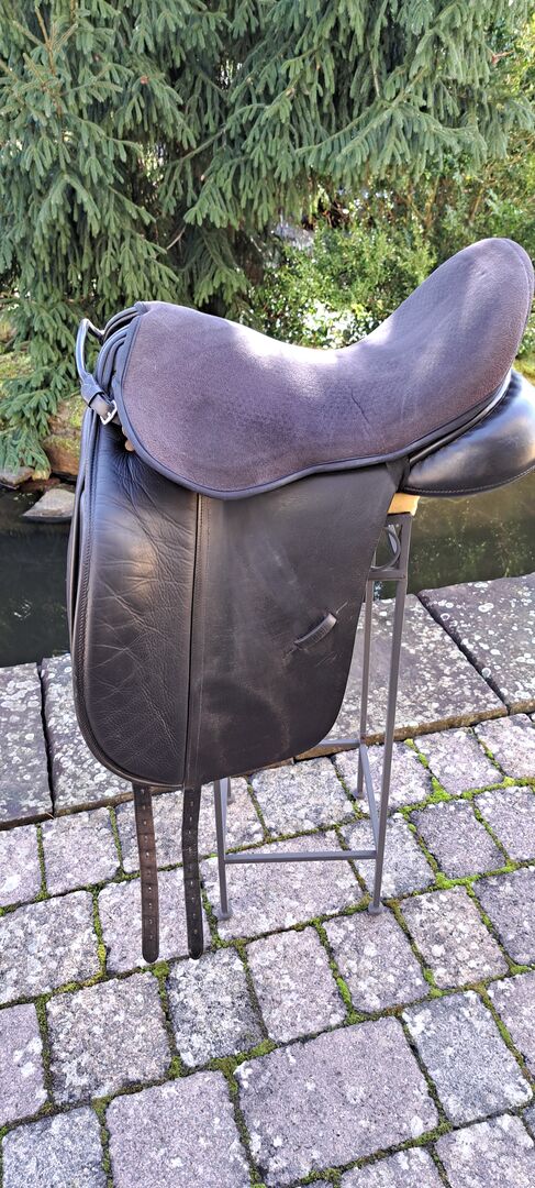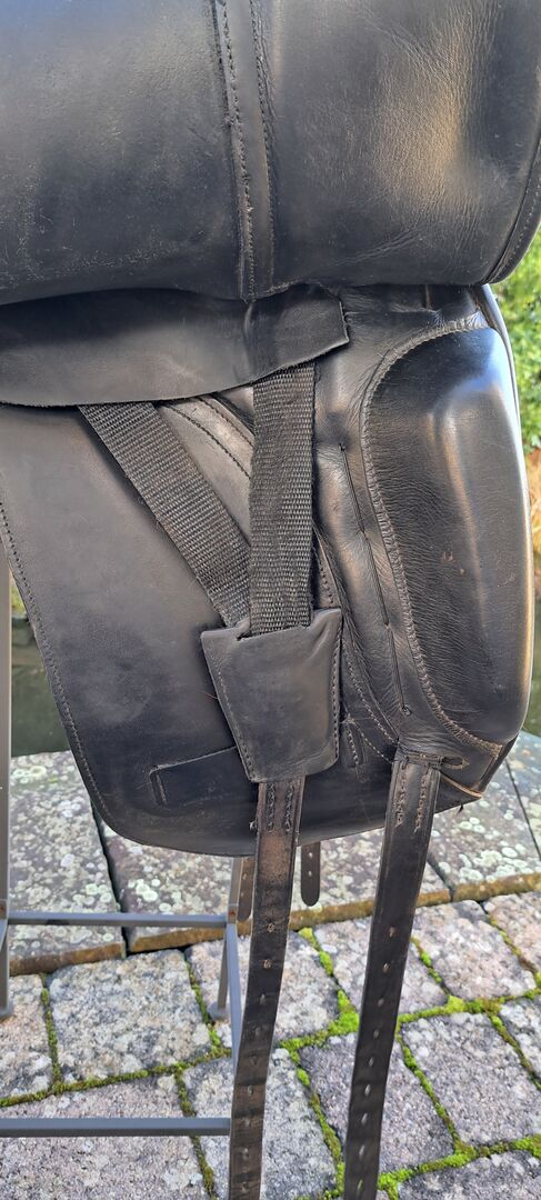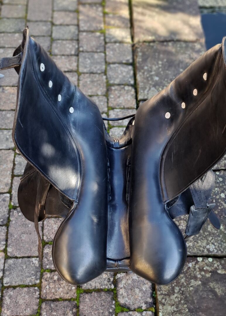 I offer here a dressage saddle of the brand Albion. Model: SLK HH NS Size: 17" Chamber width: M Color: black I bought the saddle second-hand. As the seam on the pommel came undone, the saddle was stitched by the saddler and covered with a piece of leather. It was already like this when I bought it. I have always used it with a gel pad, which is also included here. The saddle has now been checked again, everything is fine. Freshly greased. Stirrups and new stirrup leathers are also included. (not on photo) Private sale no guarantee, warranty or return. Shipping possible by arrangement. PayPal available. Saddle is offered in Billyrider and Ebay classifieds.