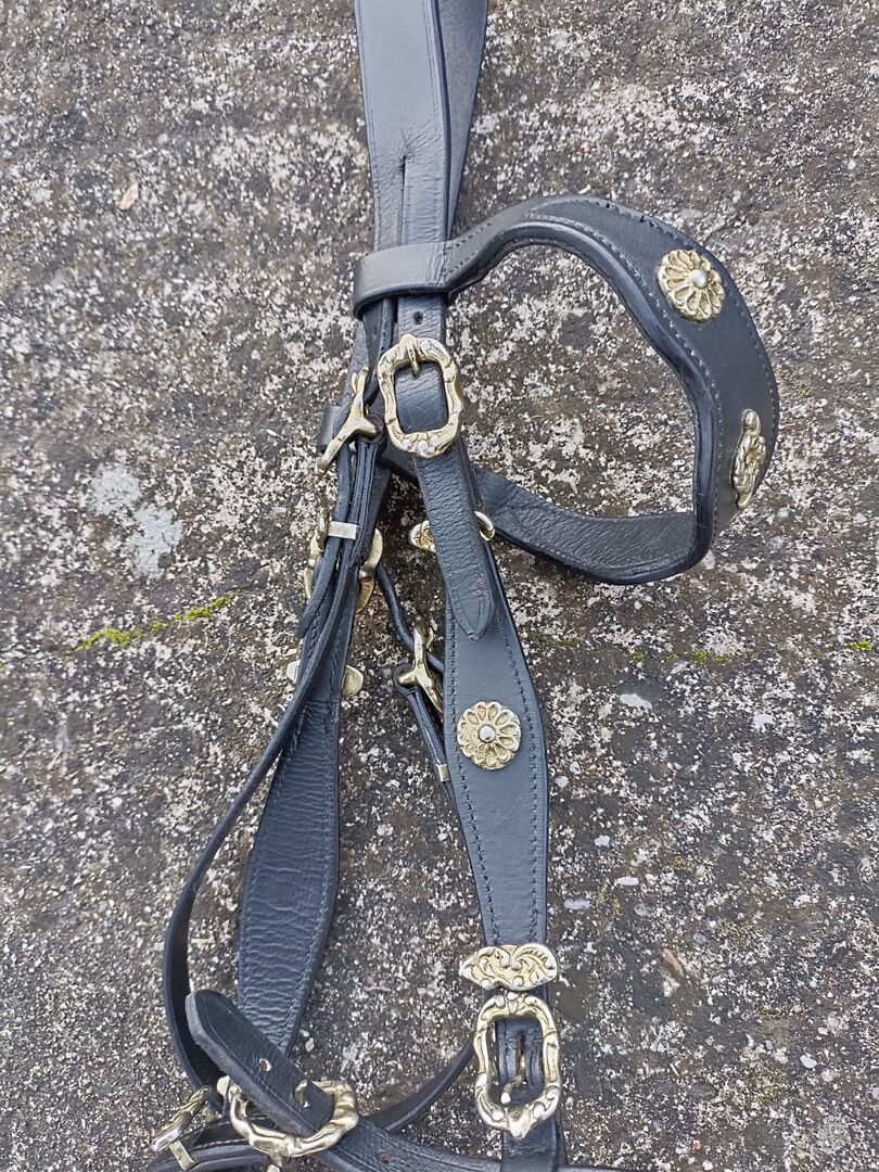 Baroque bridle in black - Baroque bridle made of black leather Condition: very good - has been maintained and cleaned Baroque bridle dimensions: from cheek piece, over neck piece, to the other cheek piece (100 cm), neck piece Br. (3 cm) Reins dimensions: length in total (3 m), width (1,5 cm) Decorations: very fancy and noble (probably brass) Bridle buckles: also brass (give high quality look) Reins are incl.