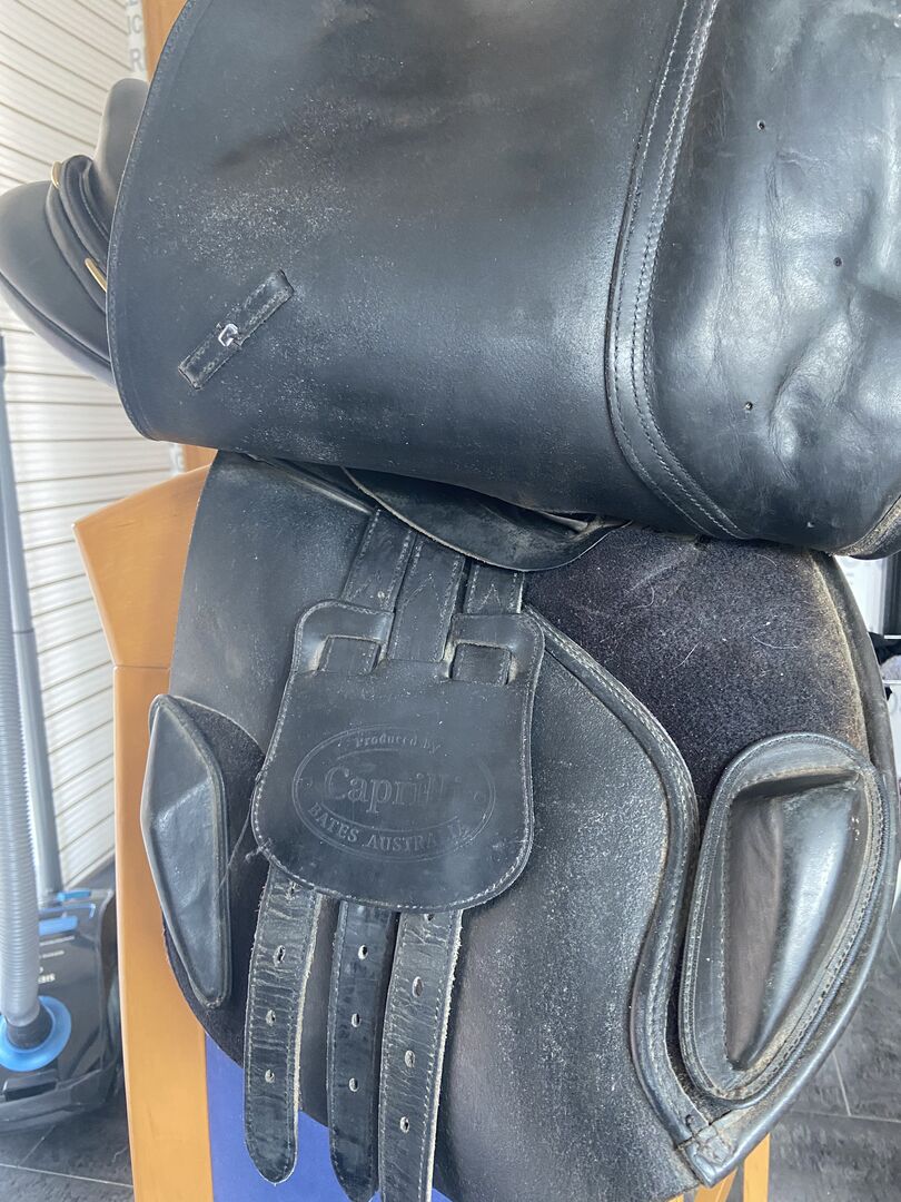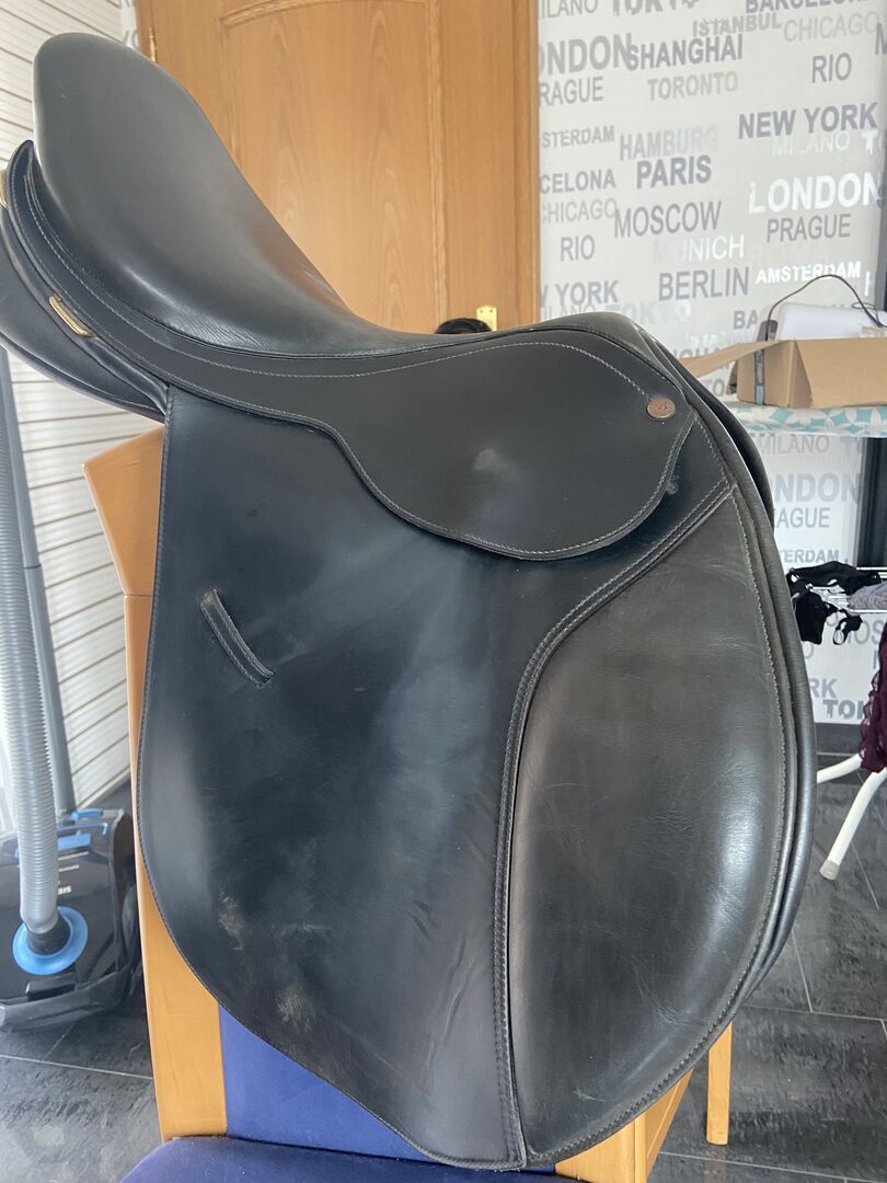 Bates Australia Jumping Saddle, 17,5" - I sell my still well preserved Bates jumping saddle. Please see the pictures for signs of use. The saddle has 17.5 inches, gullet plate interchangeable. I will gladly give the matching stirrup leathers (without stirrups themselves!) without changing the purchase price.