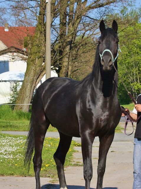 Beautiful black mare for breeding and ground work - Beautiful black Oldenburg broodmare 2013 by Jazzman/Delamanga/Fidermark/World Champ approx. 170 cm out of one of the best Westphalian mare lines Mare has had 5 great foals so far. All long-legged, tall, strong-moving and with a super lovely character. 4 x black and 1x dark bay. Video of the mare and pictures of her offspring can be sent on request. Her dam line is one of the best in Westphalia. It is the line of Glocke by the successful breeder Schulte-Böcker, who already bred the stallion of the century Florestan. Granddam is a full sister to the former German Bundeschampion and later Grand Prix horse "Fürst Fabio" and another brother, also successful up to Grand Prix level in Holland. Mare is very kind, sociable and compatible with herds. She is also a treasure with farrier and vet. She is a very healthy mare and was only treated for colic 2 years ago during pregnancy due to the position of the foal. But nothing was cut out, just turned out and she carried her foals and gave birth without any problems. Since then she has never had any problems and according to the vet there is no risk of further pregnancies. Insemination with the desired stallion would be possible immediately or the mare has never been lame or ill (except for slightly thick fetlock heads as she likes to plop on them when standing up) and could therefore certainly be interesting for ground work and leisure.