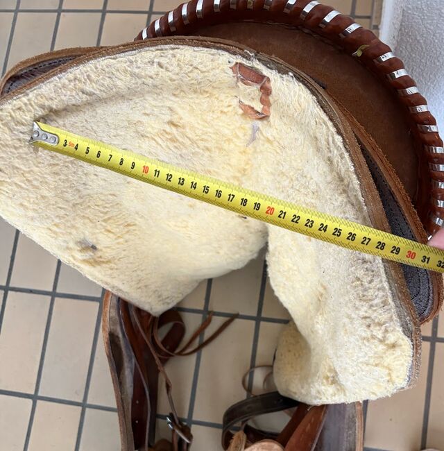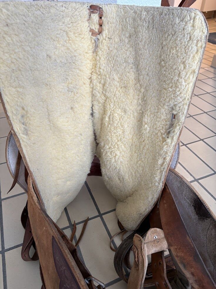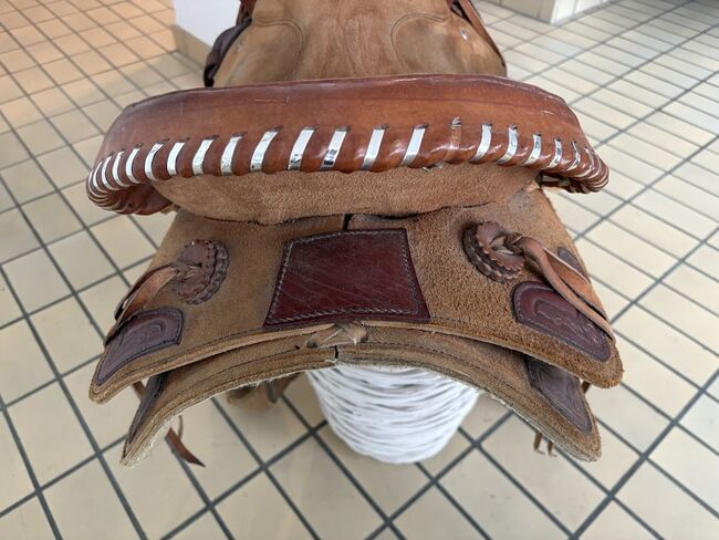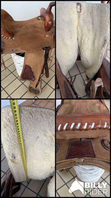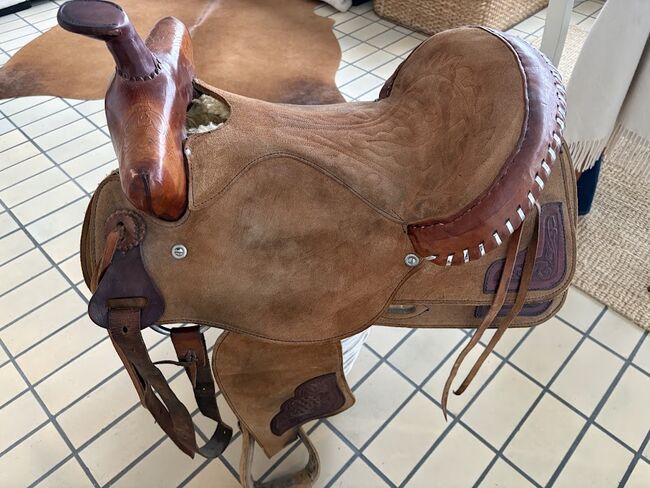 Beautiful suede saddle - The beautiful suede saddle weighing only 11 kg was used on a young quarter horse (normal conformation) and is unfortunately a little hard, but comfortable with a lambskin cover. It is no-name but very well made and the suede leather provides a wonderful seat and support - no comparison to smooth leather. Seat size should be 14 inches or dress size 38. Collection in Zurich Zumikon or shipping against postage are possible.