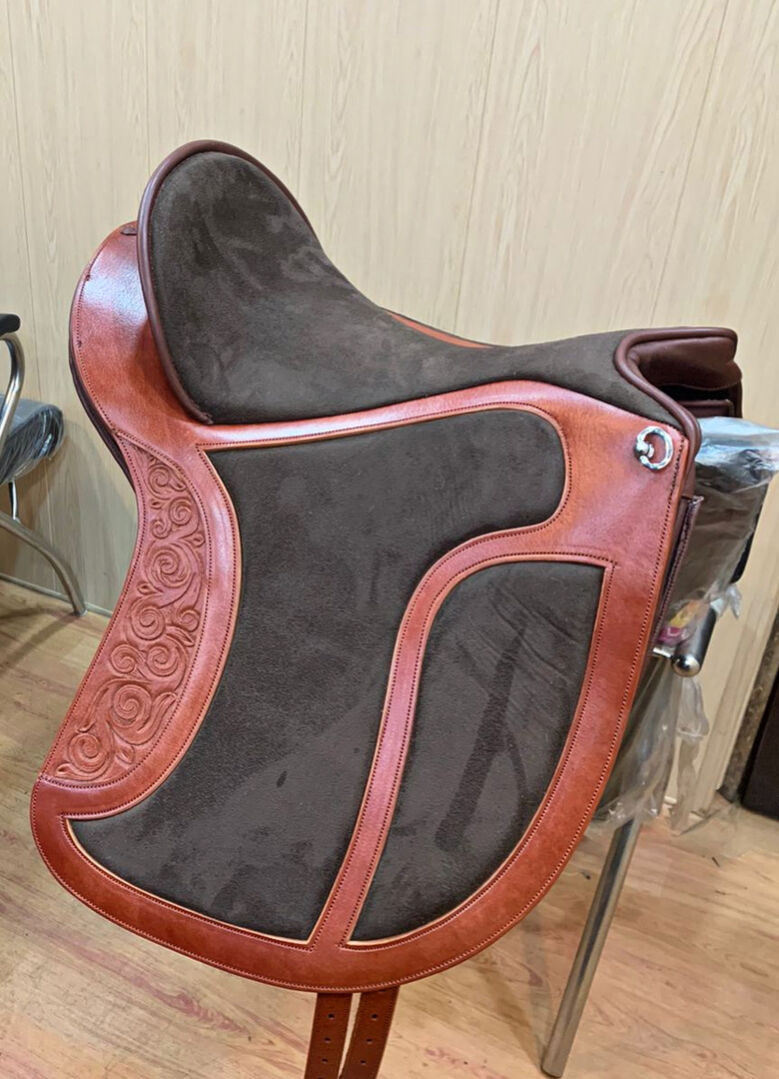 Beautiful treeless treeless trail/barock saddle 17,5 - Selling a new 17.5 inch trail riding saddle. I have had 2 saddles made to my specifications but now only need one. With velcro panels on the underside which are very easy to adjust. In addition, there are 4 gullets including the one that is installed, which is also very easy to change yourself. Long girth straps. The Velcro pads on the knees are also adjustable. No shipping on trial ! Paypal available.