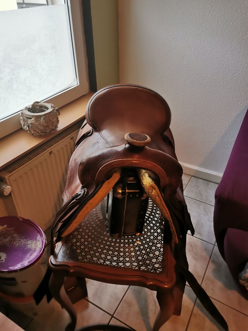 Beautiful western saddle - Beautiful western saddle. Unfortunately, he no longer fits and therefore he must move on. He unfortunately has some scratches. The original stirrups have been nibbled, I will gladly send them along. If you have any questions please write. I am willing to take back the saddle if it does not fit within 14 days however the buyer bears the return shipping and the saddle must be paid in full before!!!!