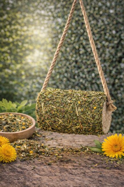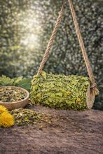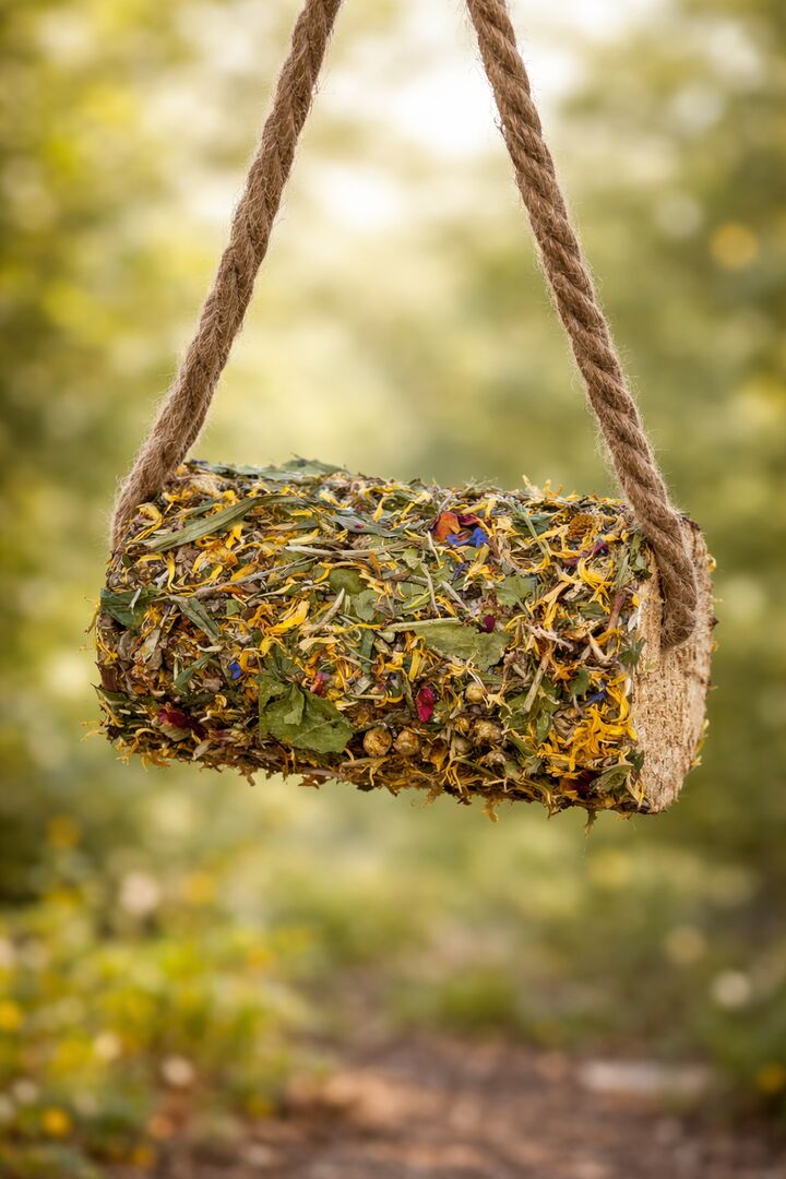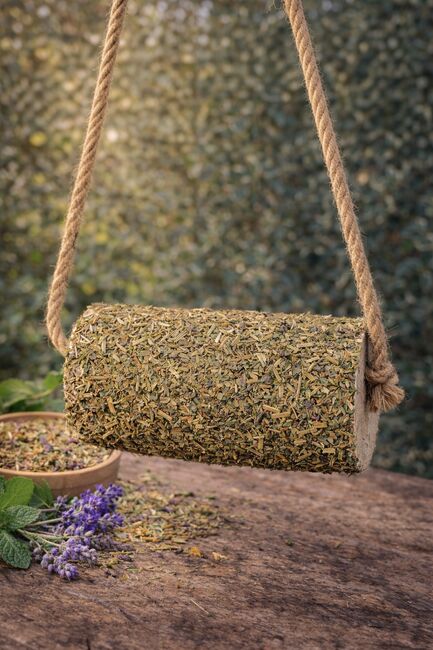 Natural nibbling wood made from untreated birch wood, handmade and with coarse, carefully selected herbs.