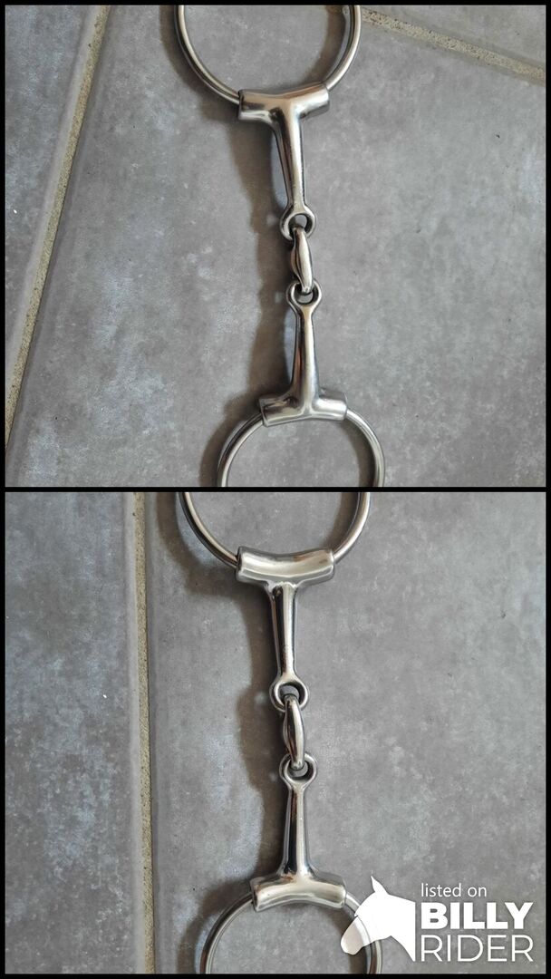 Bit remontent snaffle - Hello, sell this bit in size 14.5. It is double broken and a kind of mixture of olive head bit and water snaffle, because the rings can be moved and turned completely. Of course it has the usual signs of use from the horse chewing, but has no rust or the like. Gladly make an offer! NP: 26,90€