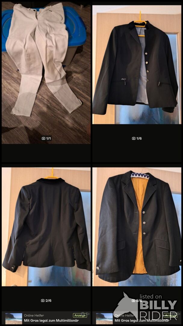 BOOTS, BLOUSES, JACKETS, BREECHES, NEEDLE - Various items of tournament clothing for sale.