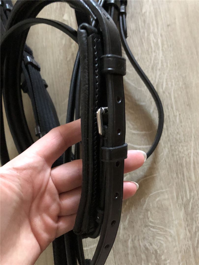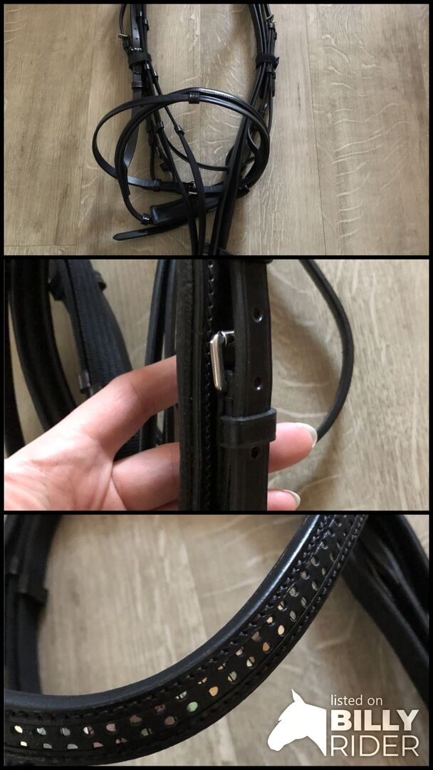 brand new bridle - brand new bridle in black Size WB 1x to try on PFERD - unused no damage, etc. Browband: silver chain under leather - elegant, not too applied - very discreet Noseband: narrow, but very good & soft padding Headpiece: wide, very soft and cut a little bit backwards for enough ear space Suitability: perfect for narrow, dainty heads; but also great for somewhat bulkier ones (bridle just doesn't come into its own here - noseband could be a bit narrow for that; only suitable for such heads, as the noseband is especially well adjustable)