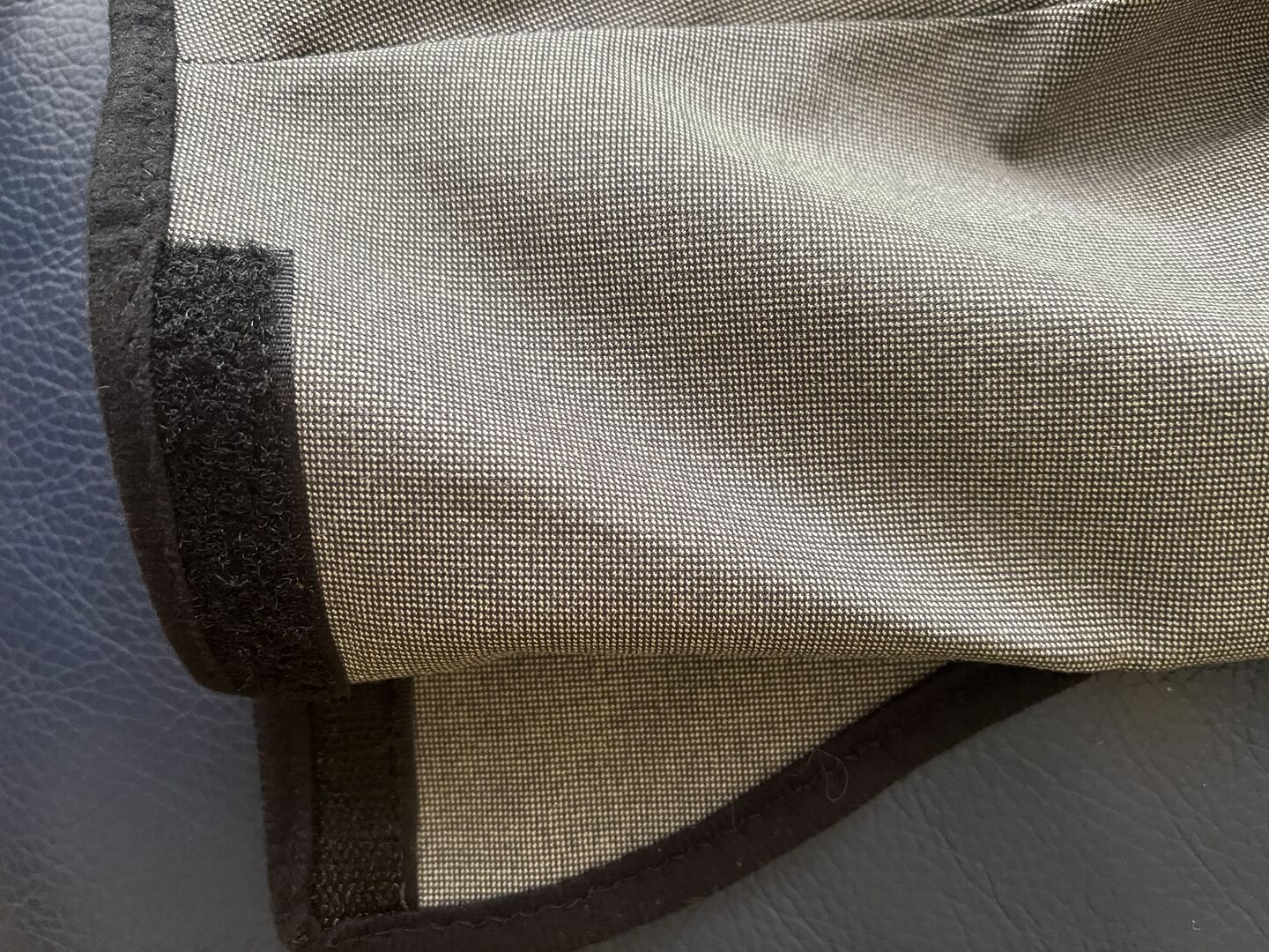 Hellgrau mit Vollbesatz in schwarzem Kunstleder.