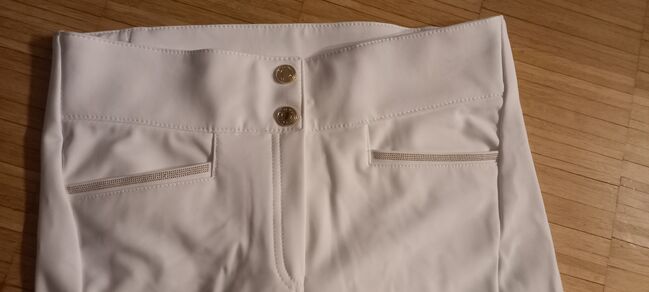 Description from dealer: -Hybrid breeches with body sculpting effect -Breathable tech jersey functional fabric -High waist -Ideal fit thanks to new waistband design: wide outer waistband -Gentle support and wearing comfort thanks to tapered waistband on the RT -Dynamic side stripes create a slim silhouette -Side cell phone pocket -Elegant rhinestones appliqués on the pocket opening, waistband and cell phone pocket