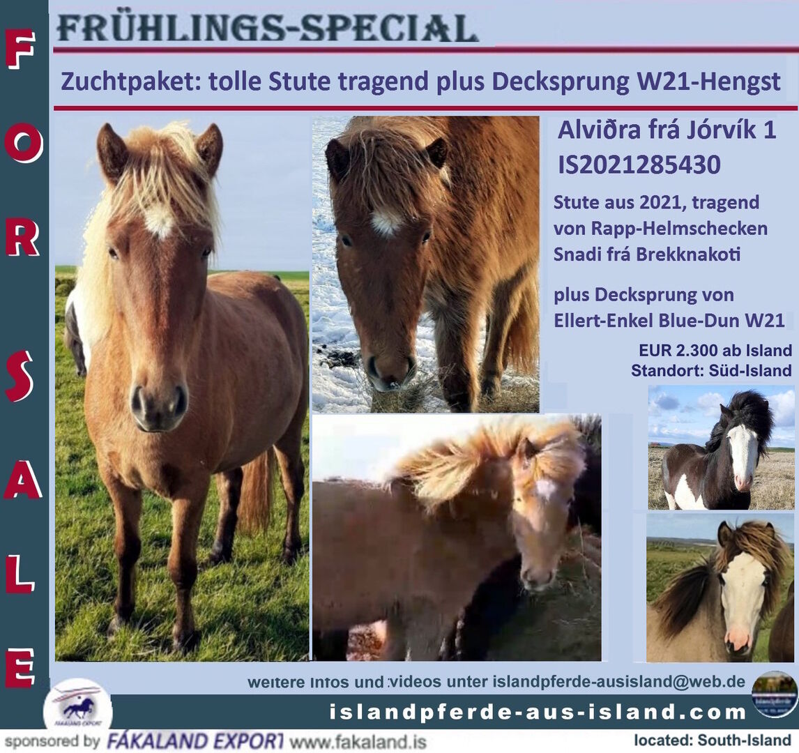 Alvidra is a friendly, human-oriented mare who has now reached the age to do something. She is ready to be released into the world. Very calm and careful to handle, she shows free-running tölt and trot and will certainly become a great family riding horse or a loving broodmare. Alvidra was in the stallion pasture in the summer and is visibly in foal (would be inspected before the purchase contract to give the buyer certainty). To make the package perfect, the price includes a stud jump this summer by the Ellert grandson (W21) who lives at the farm. And could then be imported in foal again next winter.