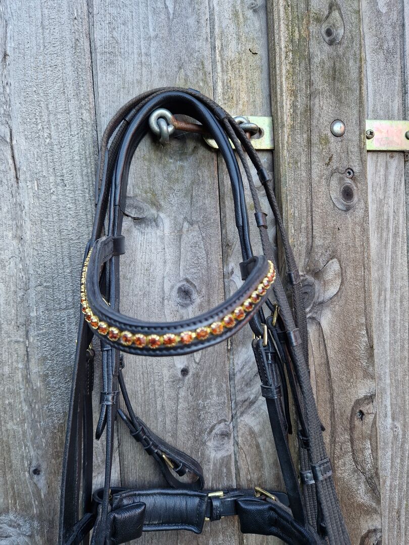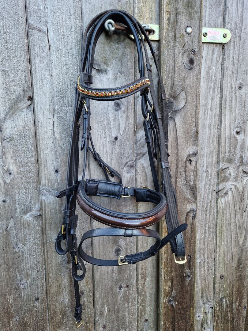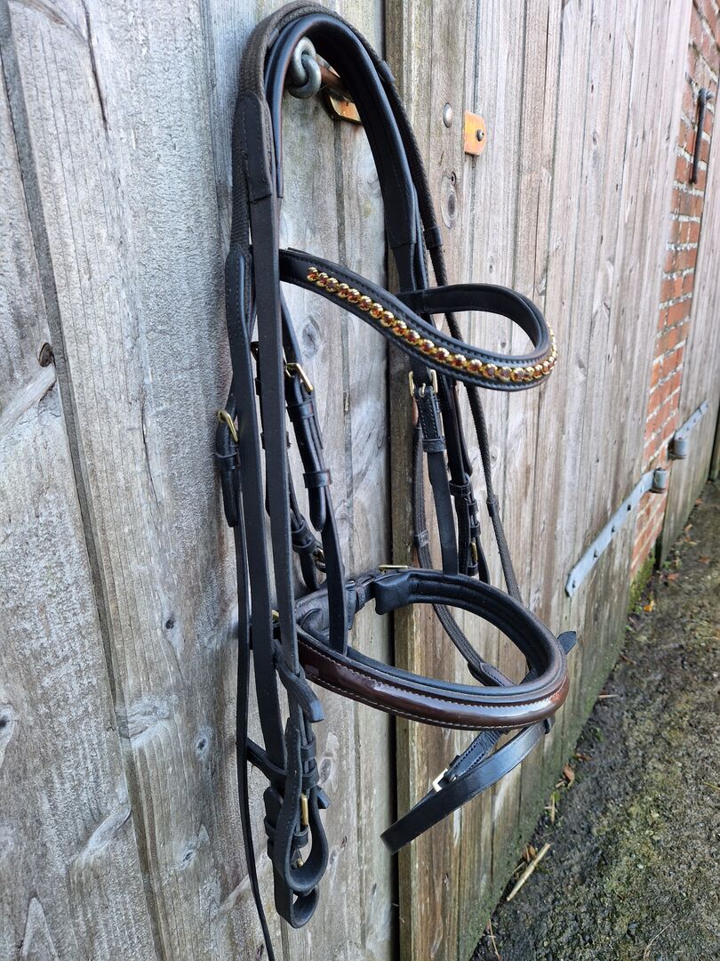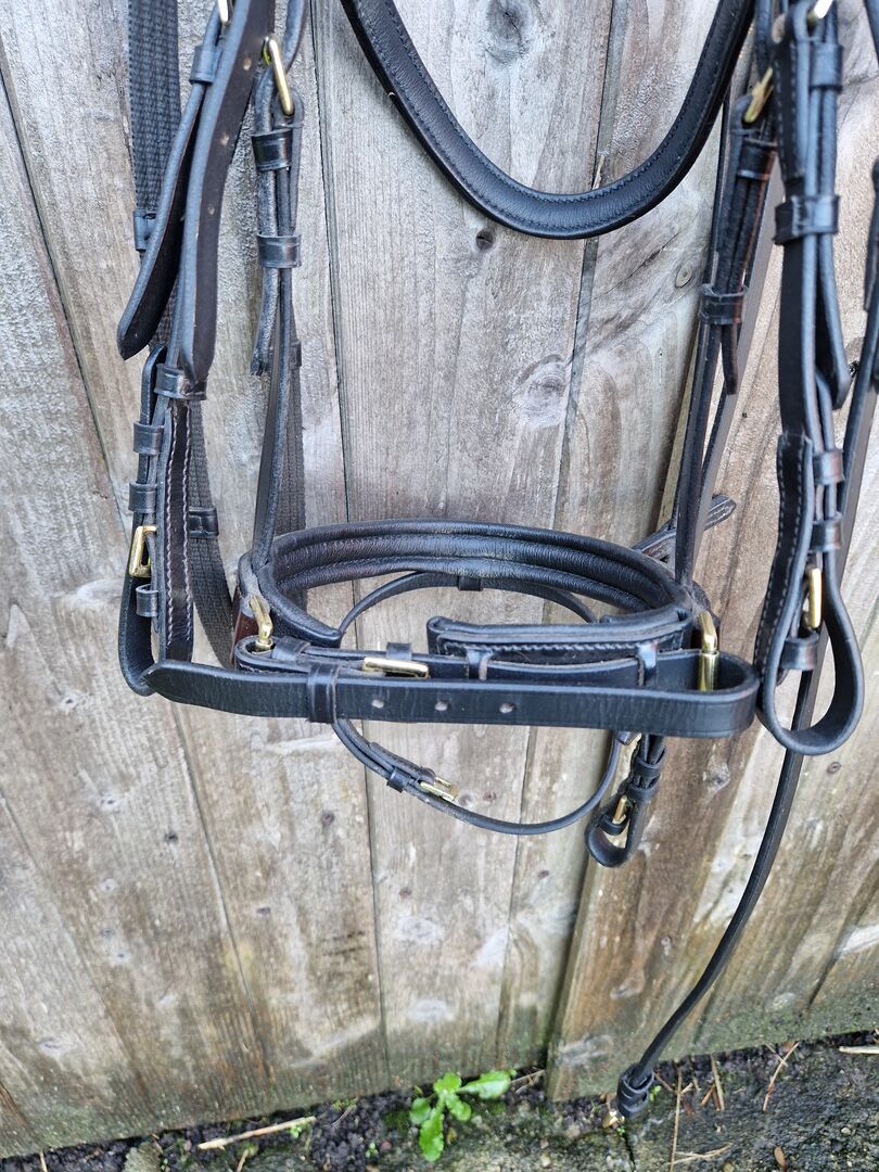 Bridle Hans Melzer model Krusemark size pony - This gorgeous chic bridle impresses with two colors and lacquer. Was only 2x in use and has no sweat off, with reins! Like new!
