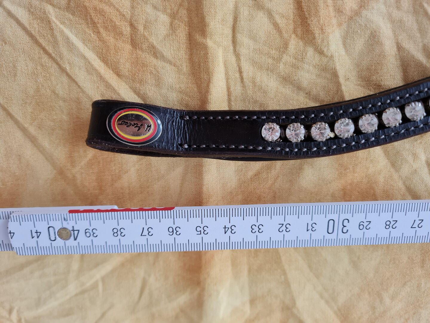 Browband Hans Melzer brown size pony, white, large stones, curved - Browband by Hans Melzer matching one of the Hans Melzer nosebands, in dark brown, with slightly larger white rhinestones, curved shape. Original price approx 40 euros.