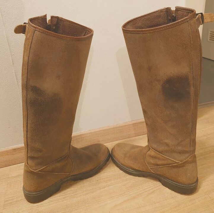 brown riding boots size 39 - Used riding boots for sale in size 39, nothing is broken, the zippers work perfectly. The calf width is approx. 37cm. Next to the zipper is an elastic area so that the boot can adapt to the leg. The shaft height is approx. 44cm.