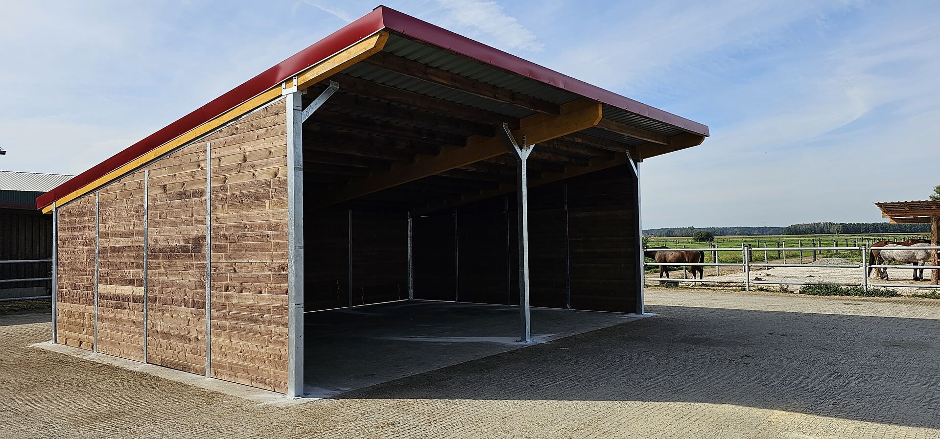 Vorteile unserer Pferdeunterstände: Sehr stabile Stahl-Holz-Konstruktion. Hohe Belastbarkeit bei Wind- und Schneelasten Schnelle Montage ohne Fundament Modular erweiterbar und individuell planbar Individuelle Planung nach Maß