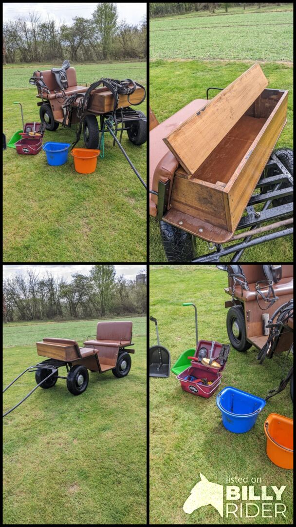 Carriage, saddle, bridle etc. - Hello, I'm selling my single-tension pony carriage, it's a bit older but can be rolled easily. The two metal tubes where the horse is clamped are currently bent in the middle. This was done to temporarily hang the carriage behind a lawnmower. However, we can remove this if required and there will be hardly any residue. The carriage also comes with a bridle, saddle, feed bucket and much more. Feel free to come by and have a look. Available in 59320 Ennigerloh