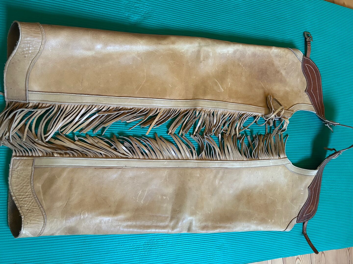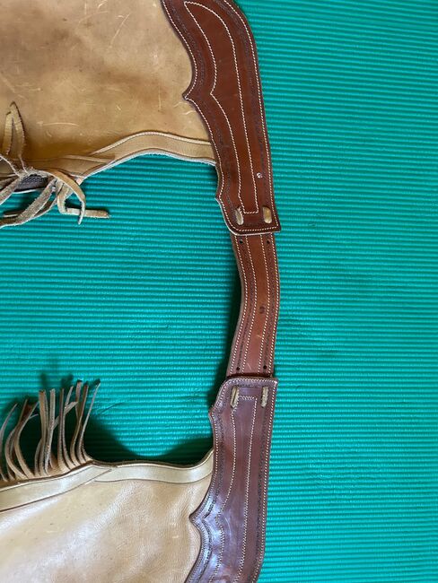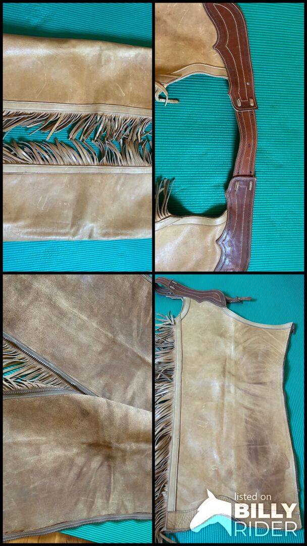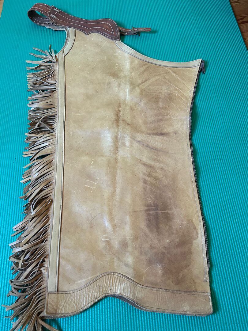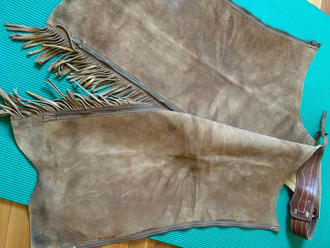 Chaps made from thick cowhide for tall, slim riders - Beautifully crafted, used chaps made of very thick leather with a sturdy zipper for a long-legged, slim rider. Dimensions: Waistband: 69 -77cm + 6 and 12cm straps, so max. 95cm, Length: outside approx. 83cm, zipper: 74cm Widest circumference (thigh): 55cm Narrowest circumference (from knee down): 43cm