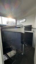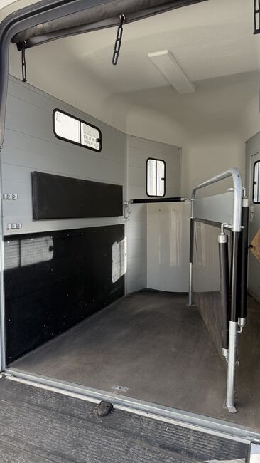 Total: 2600kg Pullmann suspension Shock absorber 100km/h approval Opening window with grille Center partition Panic lock Interior light Rubber tread strip on tailgate Adjustable box bars Aluminum floor 8mm rubber floor glued and sealed Air and light permeable tarpaulin blind Tailgate can be rotated and swiveled Double-walled, anodized aluminium wall construction Automatic support wheel 13-pin electrics and reversing lights Polyester hood with reinforcements Side cushions, side step protection, 3rd brake light Center partition Tack room High access door