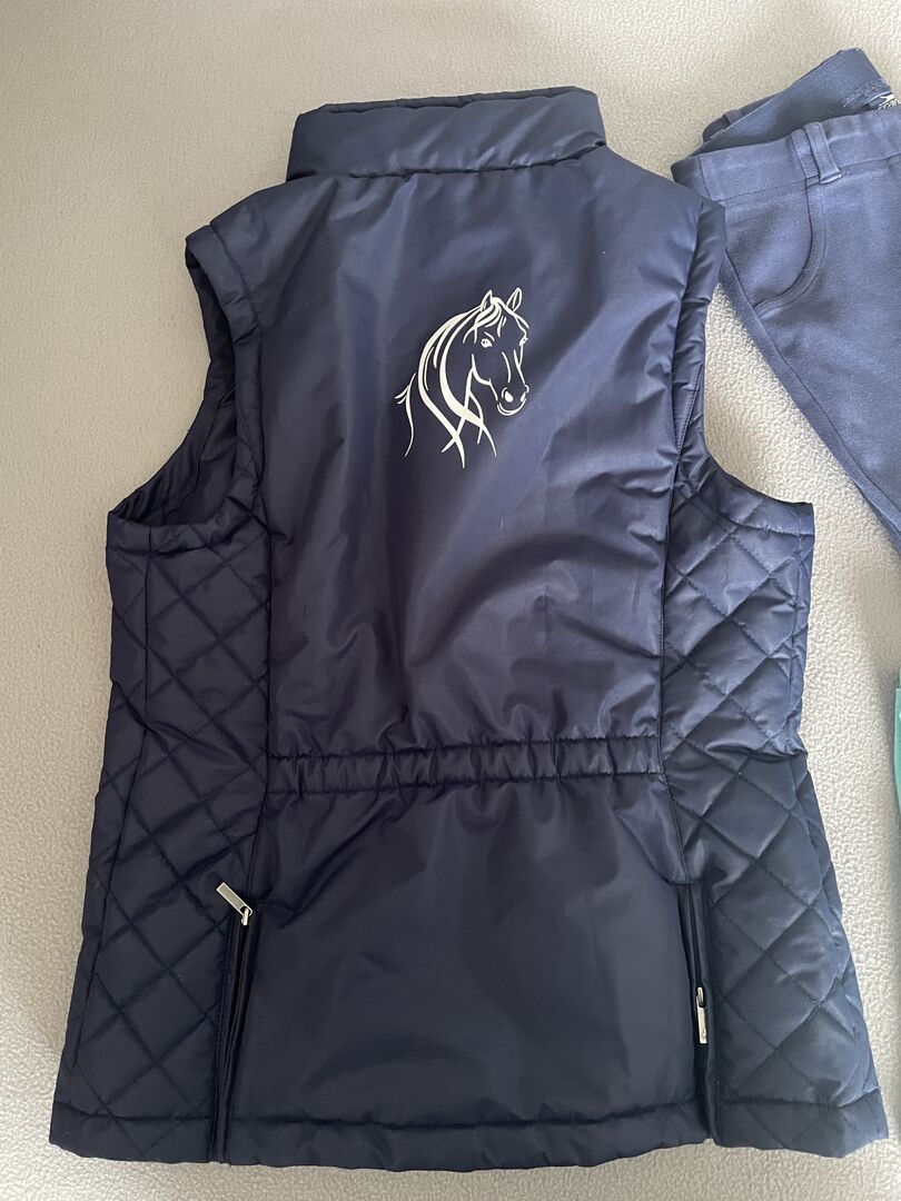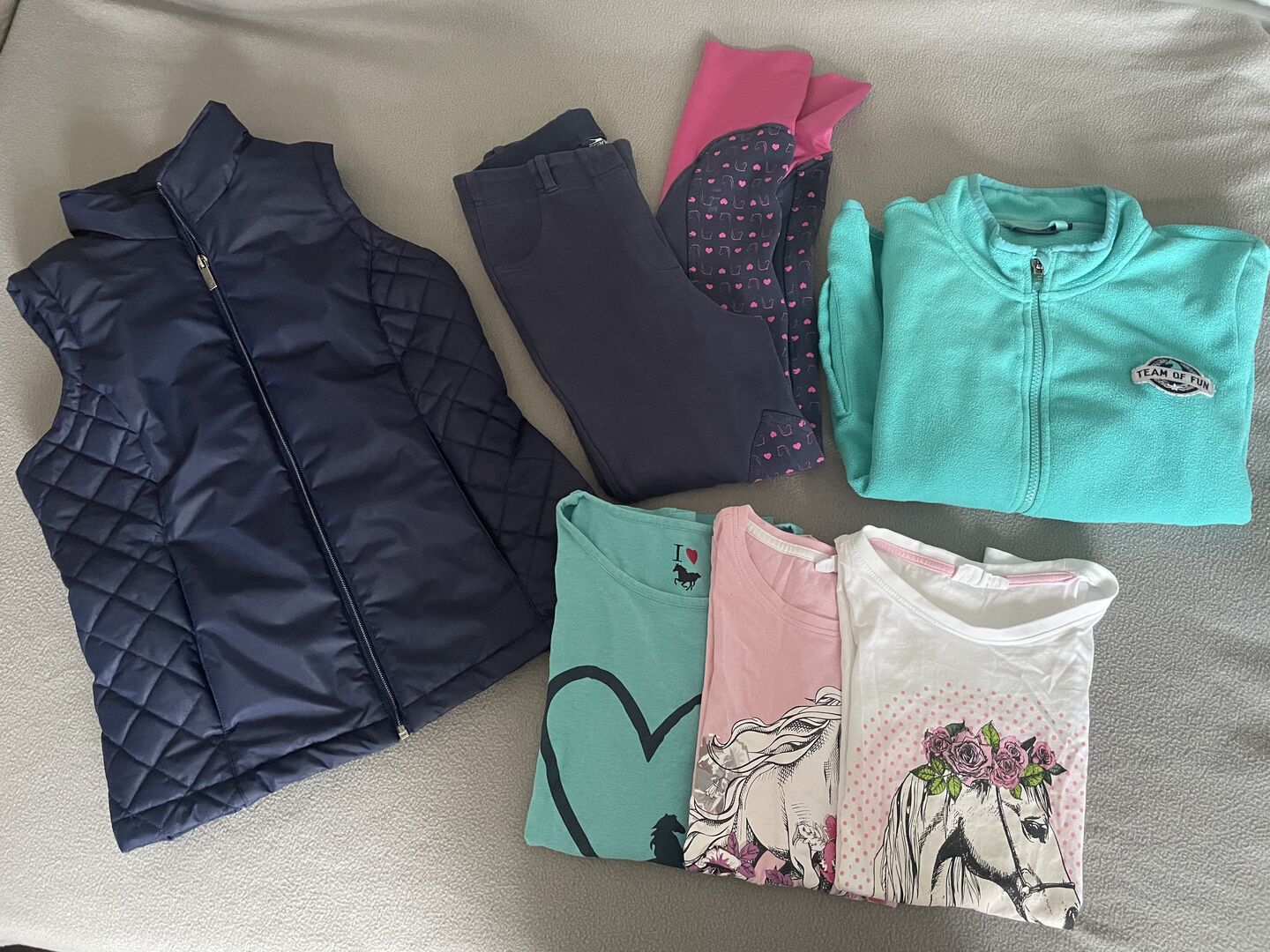 Children riding clothes set gr 152 - Offer a great children's riding set in size 152. This set consists of. - Vest - Fleece jacket - 3 T Shirts. (Unfortunately small stains, seen in the photos). - 1 pair of breeches.