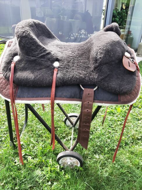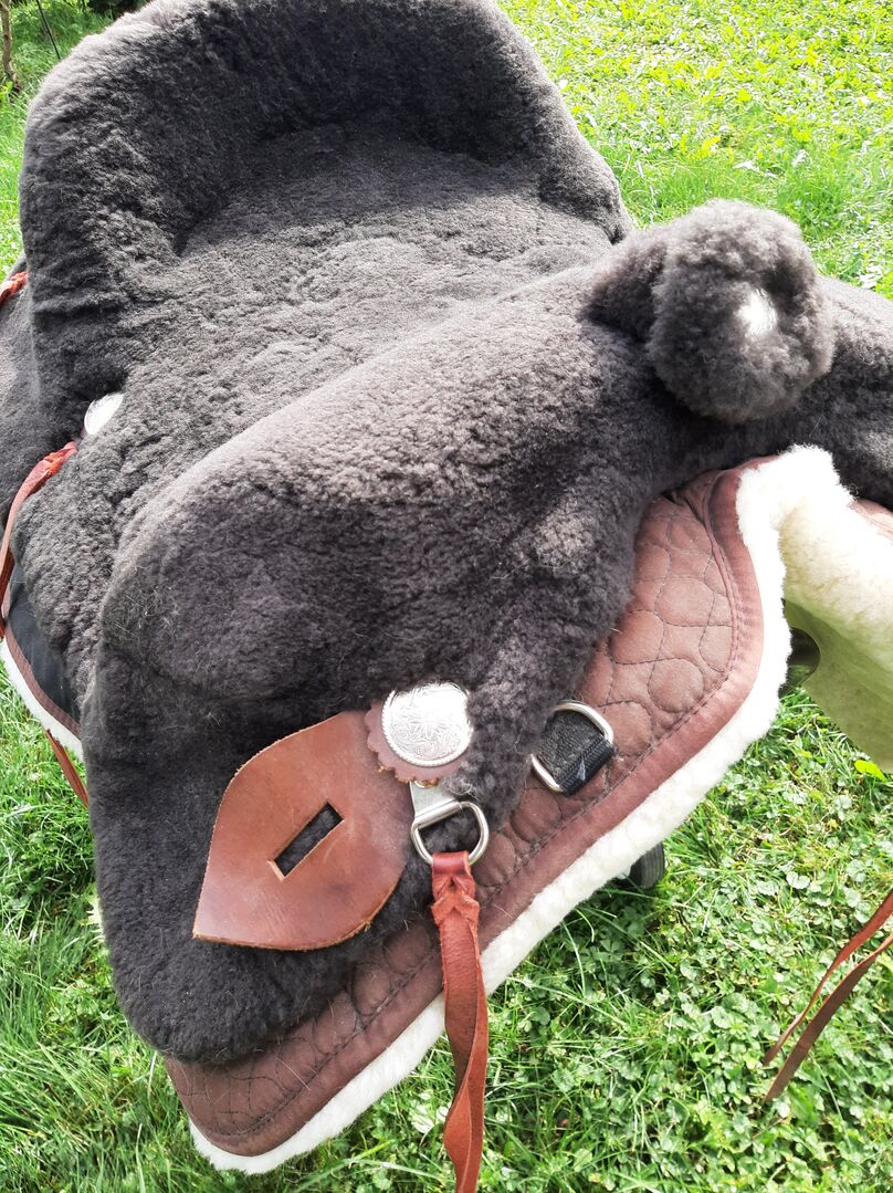 Christ Saddle Diamond Plus lambskin saddle - Selling here my hardly used Christ saddle lambskin saddle Diamond Plus. Saddle model: Diamond Plus lambskin saddle Style: Western Size: Warmblood - lay when - on Haflinger Colors: brown Seat fur brown, fabric brown, underside natural. Pommels: yes (galleries) with horn Wool height: approx. 30mm Other: D-rings for optional attachment of stirrups