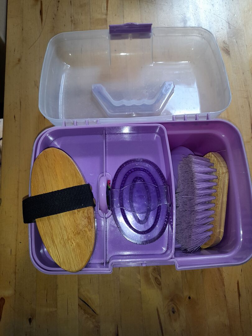 Cleaning box/pink, filled - Everything the horse needs: curry comb, grooming brush, fetlock brush, hoof scraper, mane comb and brush and container for hoof grease.