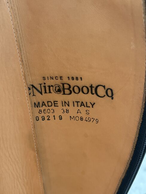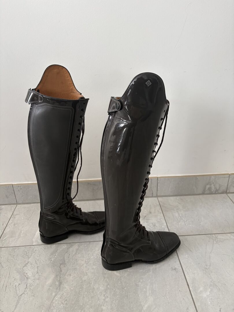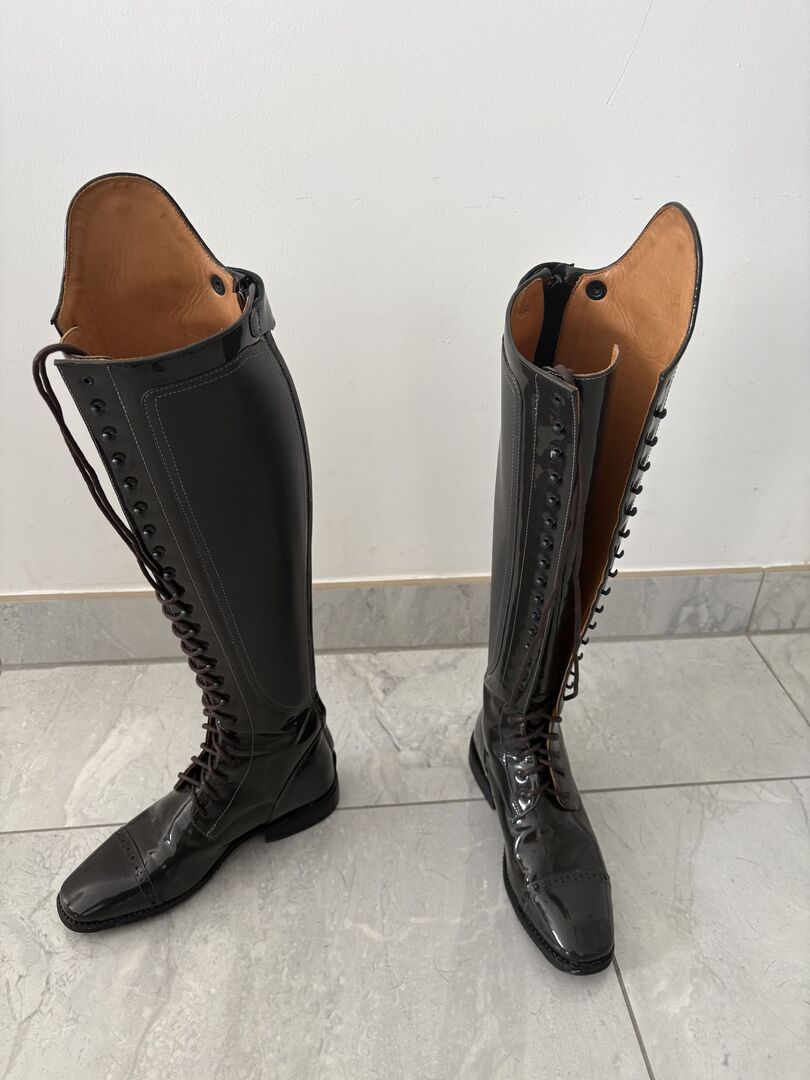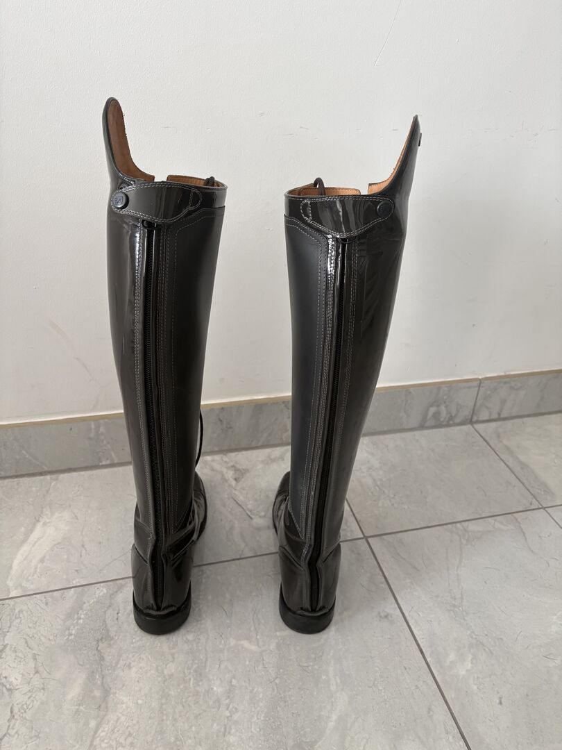 DeNiro boots - size 38 - gray/lacquer - hardly worn - I am selling my high-quality DeNiro brand dressage boots in size 38. The boots have only been worn approx. 5 times and are in very good condition. They were purchased in 2021 and then stored dry as I have given up riding. Details: Brand: DeNiro - Size: 38 - Color: Grey / patent - White stitching - Hole pattern on the front of the shoe - Condition: very little worn - Original price: 944 € - Further measurements can be found in the pictures Price: VB - realistic offers can be sent to me. Private sale: Sold as seen, therefore no guarantee, warranty or return. Shipping or collection possible.