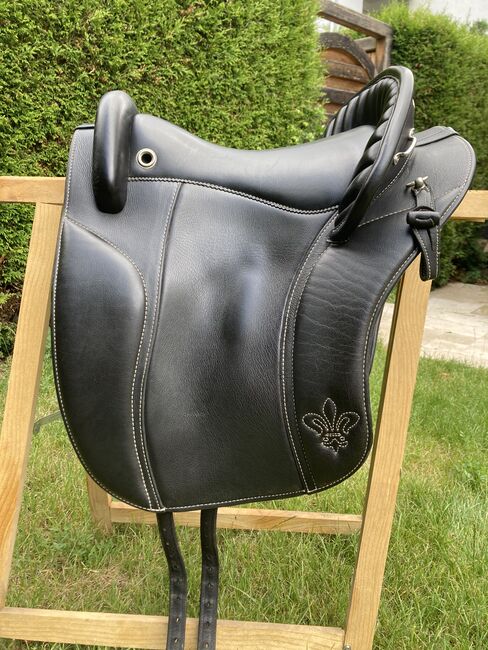 The saddle is in very good condition with few signs of wear. It has no cracks or damage. The seat and soft knee area are very comfortable with a secure and pleasant feel. The saddle is suitable for dressage work as well as for long, relaxed rides. A saddle cover and stirrup straps are included. In addition, Velcro dressage blocks, a saddle flap with matching foam rubber in blue/black and an Allen key for independent adjustment of the gullet plate can be purchased. (Price by arrangement). Private sale - no guarantee or return. If you are interested or have any questions, please contact us - the saddle can be viewed and tried out by arrangement.