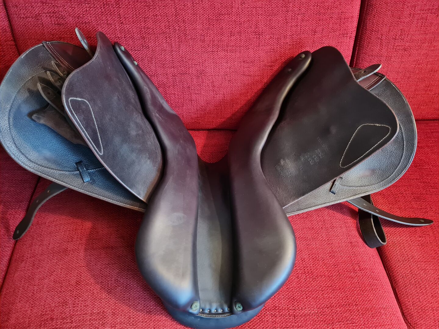 Devouxcoux jumping saddle 16 brown HAURRA - I sell a jumping saddle from Devouxcoux (size 16 seat) in brown. It is used but in very good condition (see photos). We had a fourth girth strap added by a saddler, so the saddle then no longer slipped forward in conjunction with a curved girth ("moon girth"). The saddle was on a full-size pony. There are brown leather stirrup leathers (from Loesdau) on it and light, black stirrups (plastic, Compositi) with colored tread (red).
