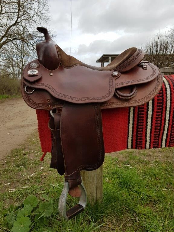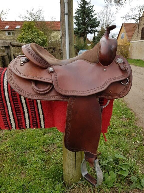 Full Quarterhorse tree, suede seat, running snake hallmarking, aluminum stirrups, exact measurements, such as distance between the conchas ,s. Photos, always stored warm and dry, little ridden.