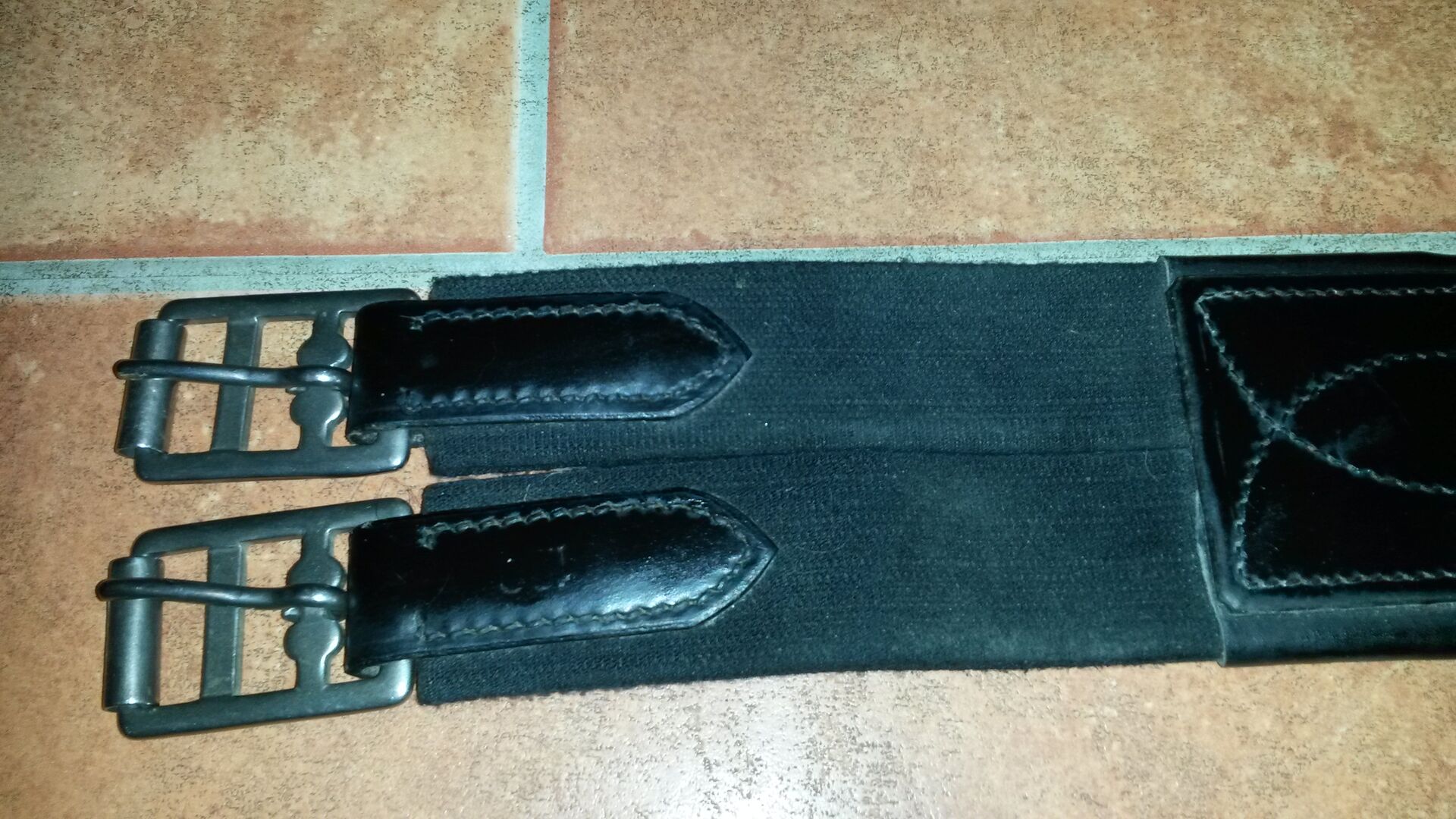 DMS saddle girth, leather, as good as new - As good as new, black, anatomically shaped, curved leather saddle girth from DMS with elastic/rubber on both sides. Used max. 5 times, length 120 cm. Hook in the middle for attaching auxiliary reins or breastplate.