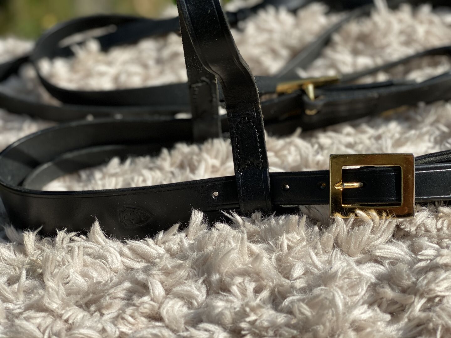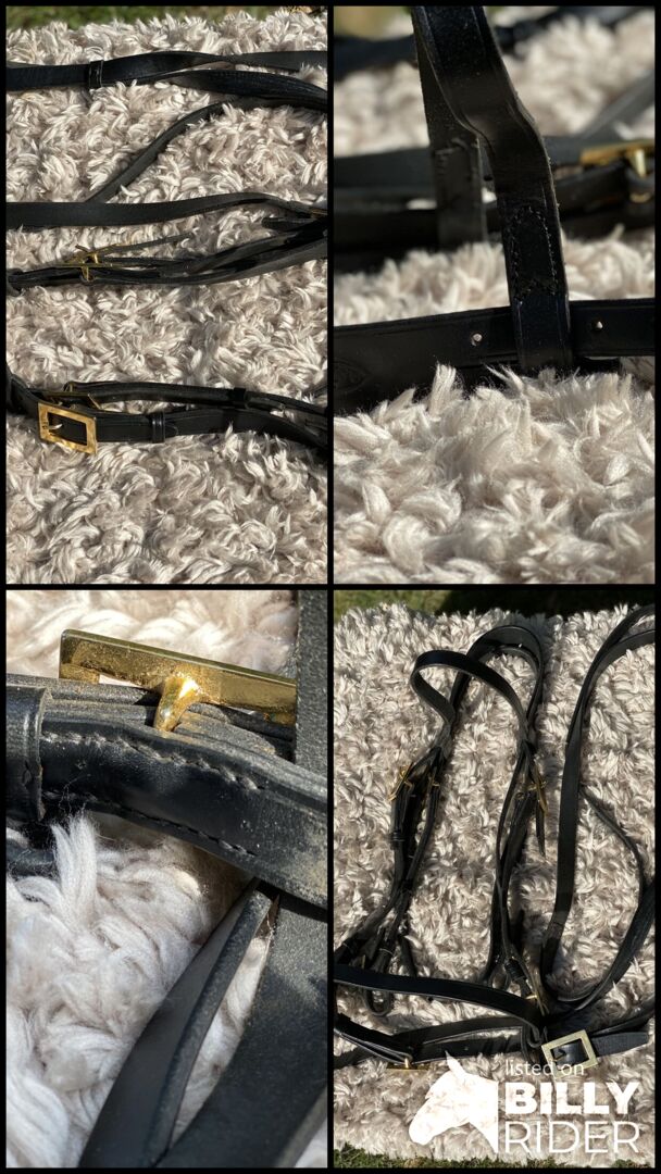 Double Double Bridle Baroque - Beautiful double bridle with reins from El Caballo in size WB, beautiful black leather with golden fittings. NP 239€ Was used as a show bridle. On the noseband there are a few traces of use, but they can be removed with little care, they are only superficial (see pictures).