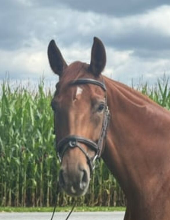 Dressage horse/all-rounder/riding mare with prospects - For sale is a pretty 7-year-old warmblood mare in an attractive chestnut color out of the mating Santo Domingo x Benetton Dream. She impresses with three good basic gaits, is very easy to ride and is currently at advanced (A) level in dressage. She also enjoys jumping with a pleasant go and a good jumping sequence. The mare has no competition experience as yet, but has been trained carefully and appropriately for the horse and is therefore a very interesting prospect for ambitious amateurs. She is looking for a rider who will develop her for further tasks. Only for sale in good hands with daily access to pasture. I will be happy to send videos if you are interested. Location: Near Warendorf