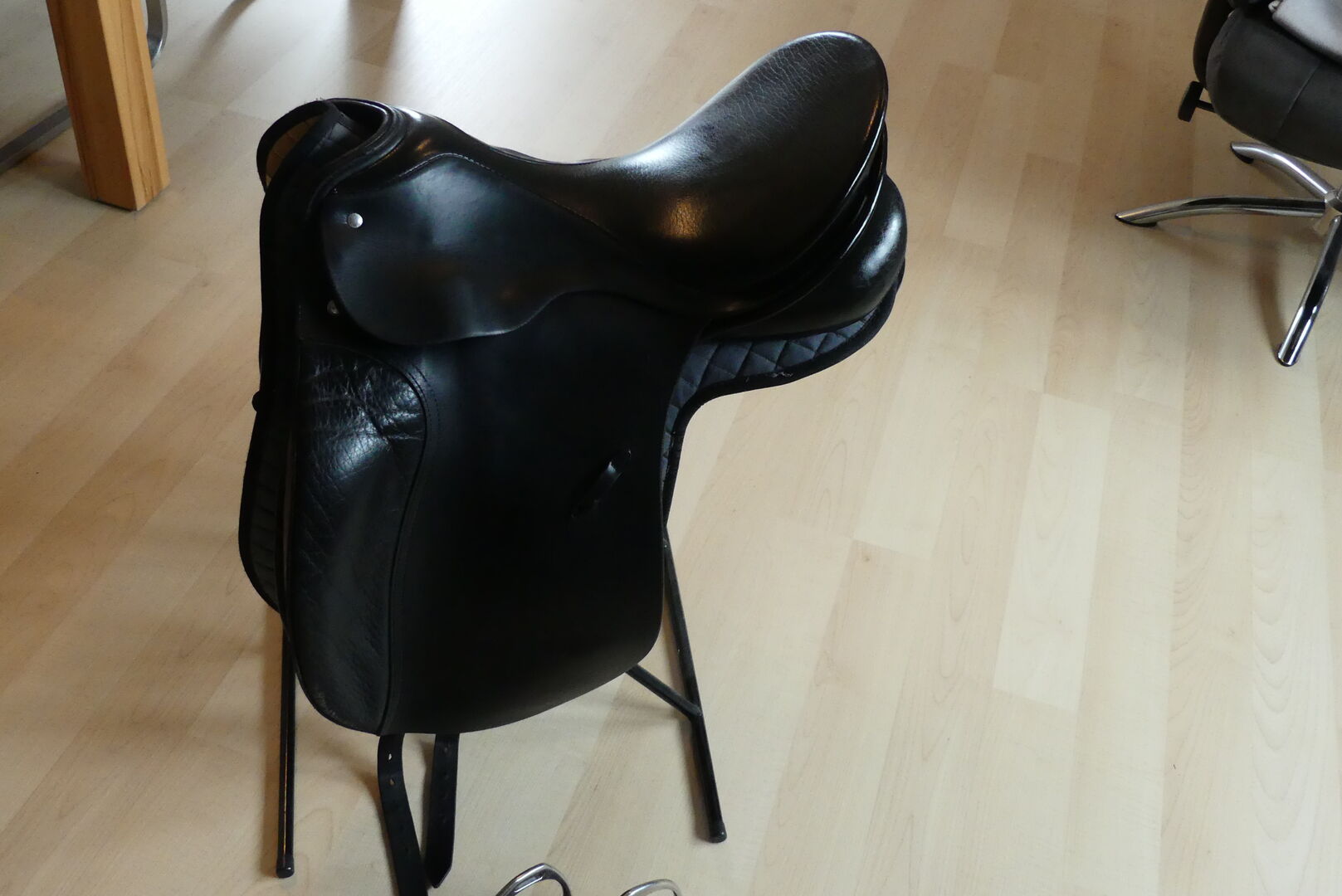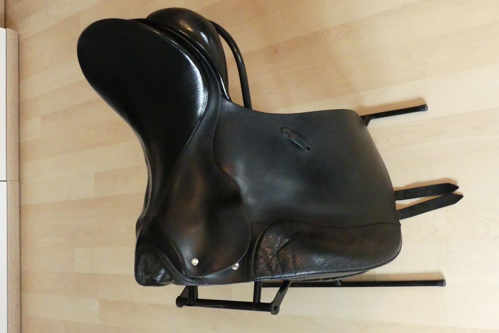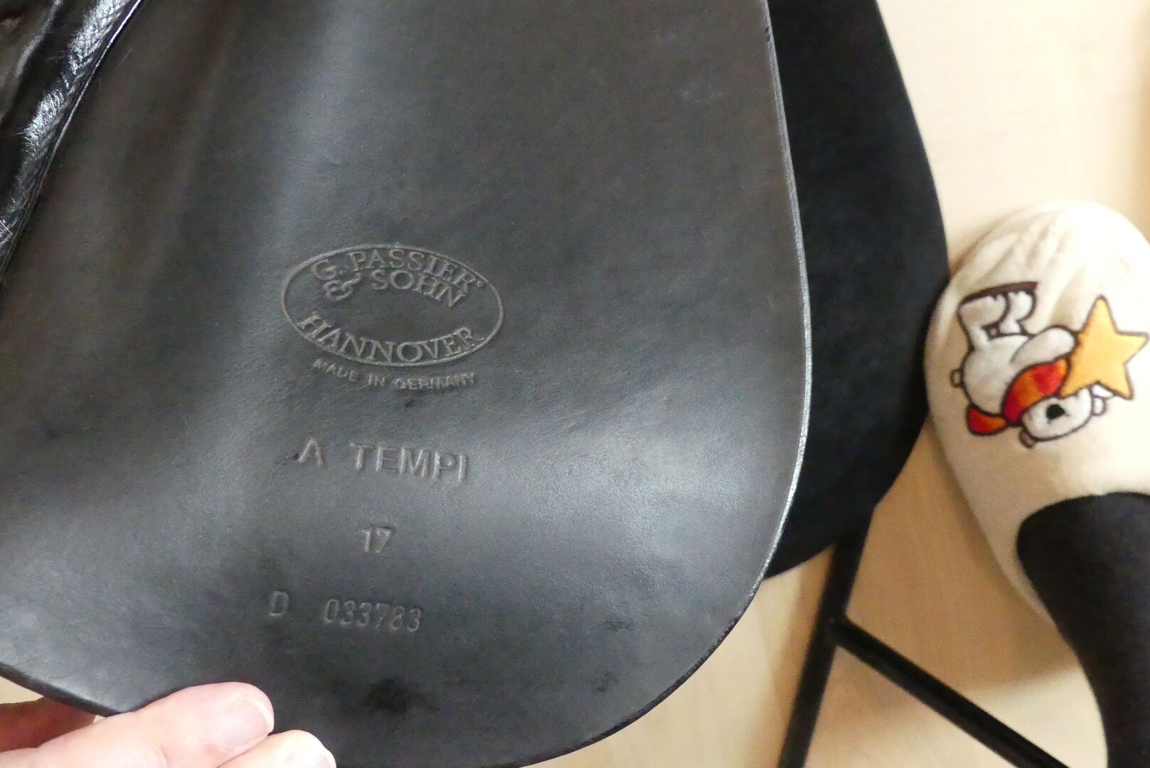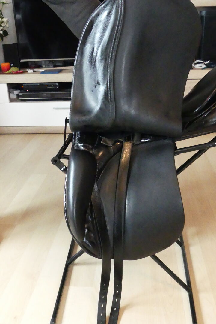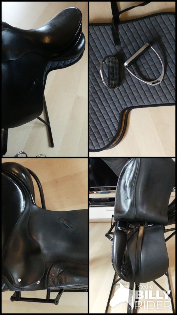 Dressage saddle - Offer here a dressage saddle from the Passier company. The model is an A-Tempi with 17" and a chamber width of 32. At that time, larger pommels were fitted on request when buying a new saddle. The saddle was on a horse with little withers. There is a small damage to the leather on the pommel (picture). Otherwise the usual signs of use of a 16 year old, but very well maintained saddle. The saddle has long stripes which are also in top condition. The saddle is delivered with a Kieffer saddle cloth (grey/black), a short girth and dressage stirrups. The shipping costs are paid by me. Since this is a private sale, a warranty or return is not possible.