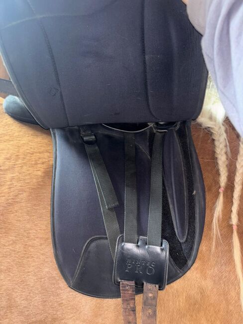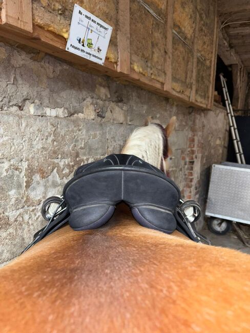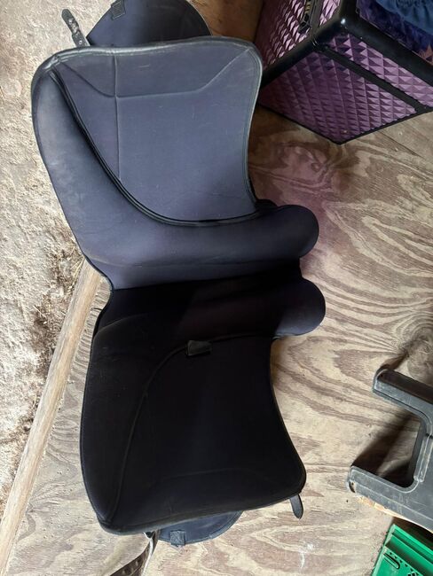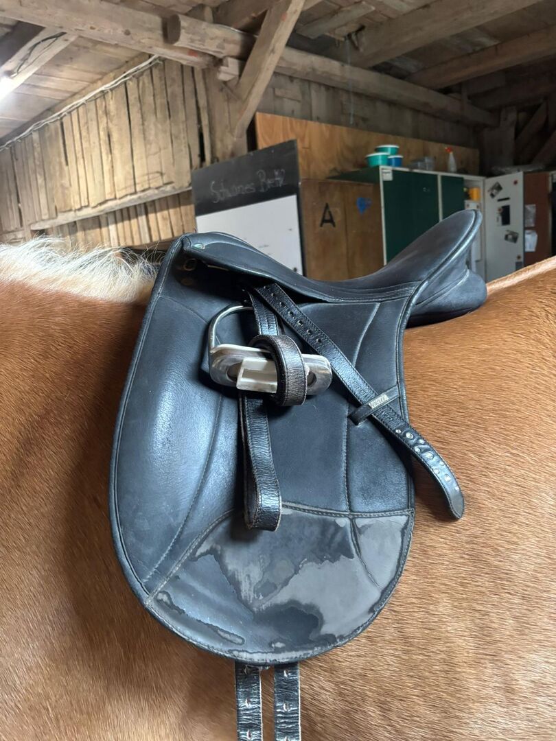 Dressage saddle, also suitable for wooden horses - I offer a well maintained saddle with two holes in the leather on one side, but the leather can be removed without breaking the saddle. The saddle is otherwise in good condition and shows normal signs of use. The previous owner cut off the girth straps on both sides, but this does not affect the riding at all