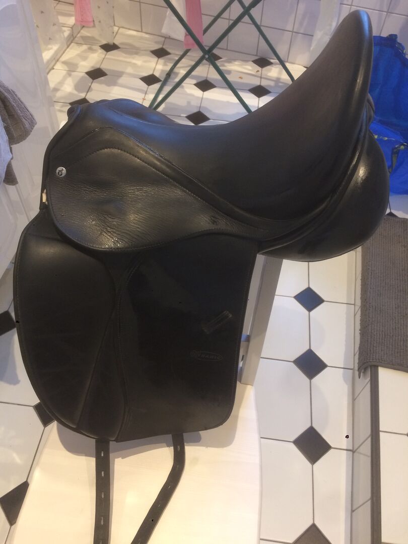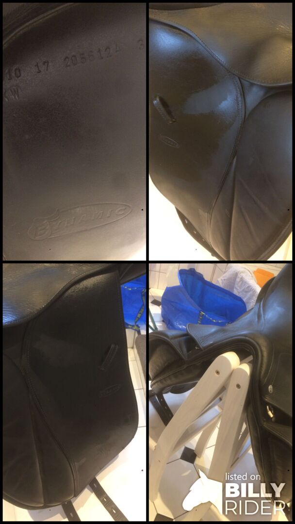 Dressage Saddle / Bynamic / 17" - By new saddle is to give away a black dressage saddle from Bynamic. - Seat 17, - medium gullet width - contact surface approx. 48cm - width of saddle channel: front approx. 11cm, back approx. 7cm Both saddle flaps have traces of use (photos attached).
