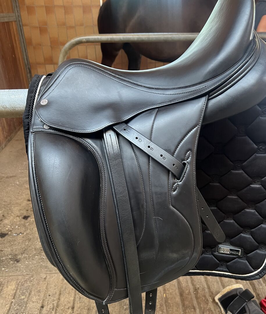 Dressage saddle Equipe oracle 17 inch kw33 - I sell my beloved Equipe dressage saddle, it is the model Oracle and he has 17zoll and a Kw 33 but can also be adjusted. He is customizable and was with us on many horses. He is super comfortable and also one of the most comfortable saddles I ever sat on. Comfortable pommels that let the leg lie quietly on the horse and allow an optimal fit. I would never sell it if it didn't fit my current mare. Everyone who has ever sat in such a saddle does not want to miss it again. It has a mono flap, so you sit close and deep to the horse. It has been checked by Equipe and is in perfect condition. He has been regularly maintained and always stored dry and warm covered with the Equipe cover. Np 4750€