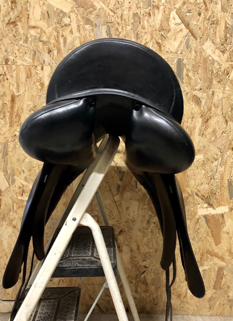 Wide cushions for a large, comfortable contact surface / wide spinal canal. 18 inch. Contrast stitching . Very wide chamber width . deep seat . Stirrup straps are included .