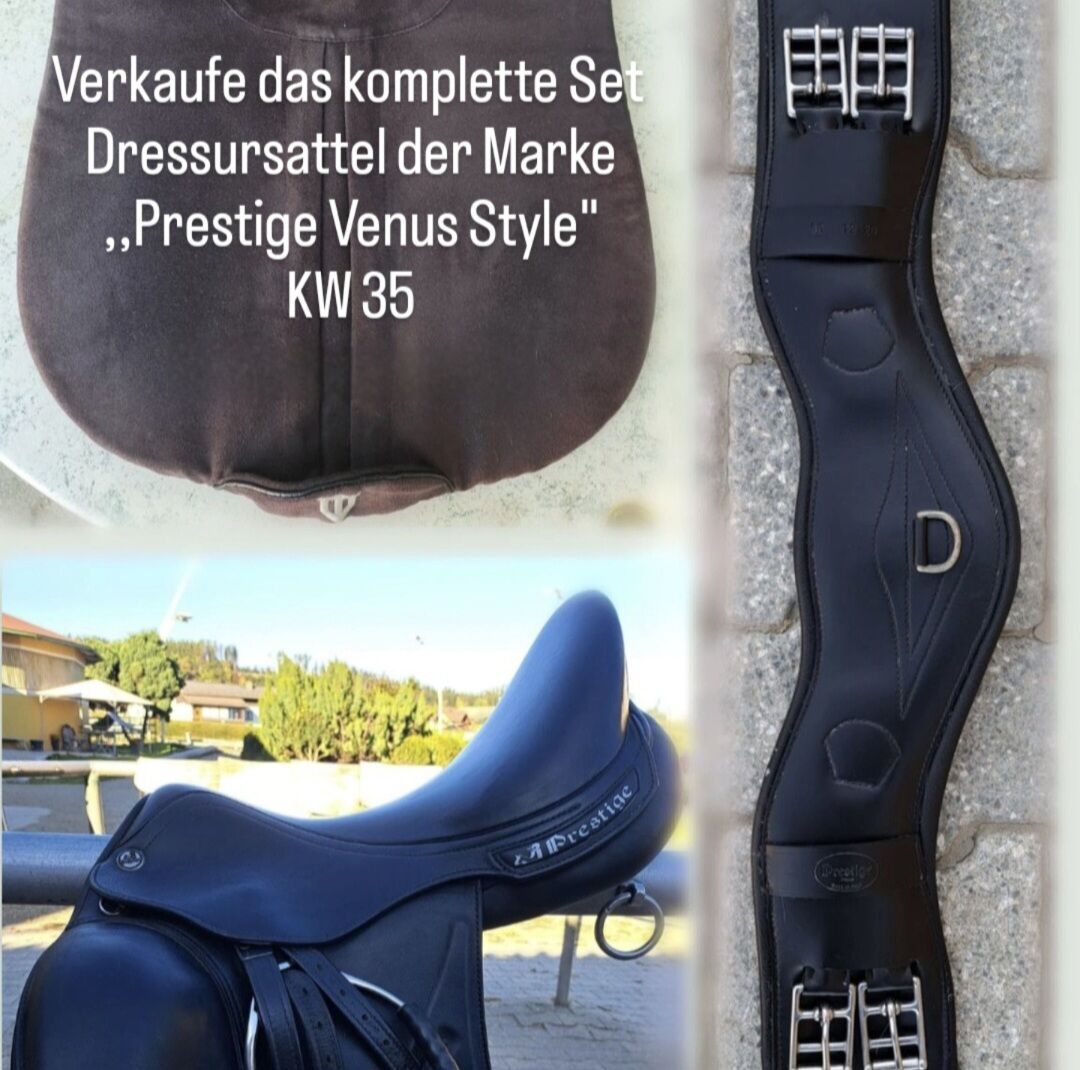 Dressage saddle ,,Venus Style" Set - Selling the dressage saddle "Venus Style" due to giving up riding, including accessories. Saddle Prestige KW: 35, Prestige girth 60 cm, Winderen pad, Stirrups incl. stirrup leathers