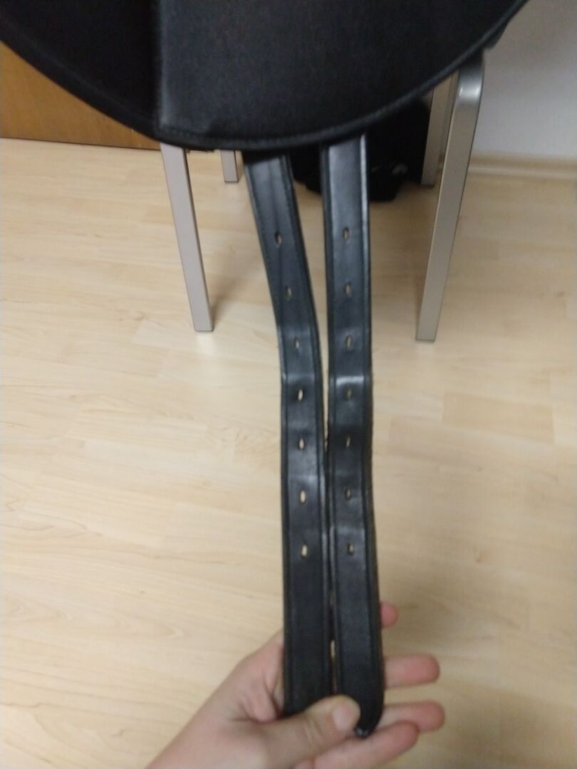 Dressage saddle Zeus from HKM - I sell here a very well preserved dressage saddle Zeus of the brand HKM. The saddle has a seat of 17 1/2". It was very rarely used, as it was used as a second saddle. The saddle has Velcro panels that can be adjusted to fit the rider. The saddle comes with two gullets in pink (Medium Wide corresponds to a gullet width of 31) and mint green (Medium corresponds to a gullet width of 30). Also included are original Wintec stirrup leathers.