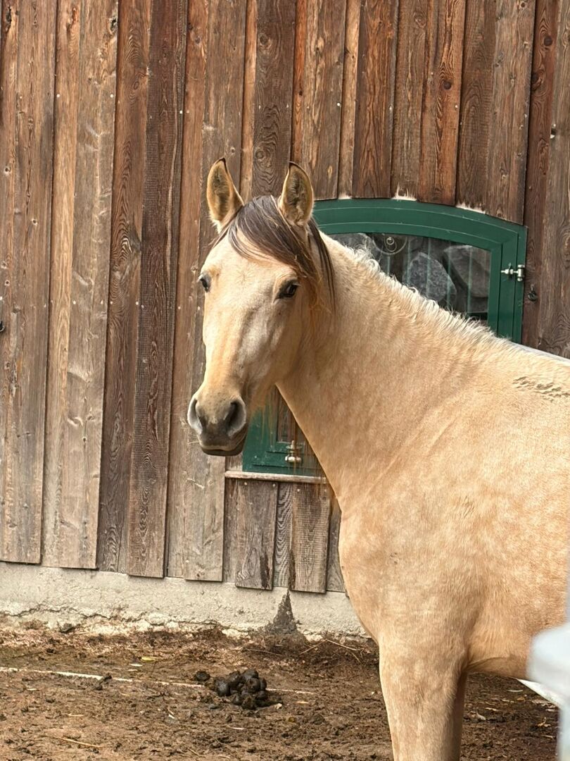 Her name is Tortola, which means "turtle dove" and the name says it all. Of course she has ANCCE paper and would also be interesting for breeding. Her father is a Cremello, as is her full brother.