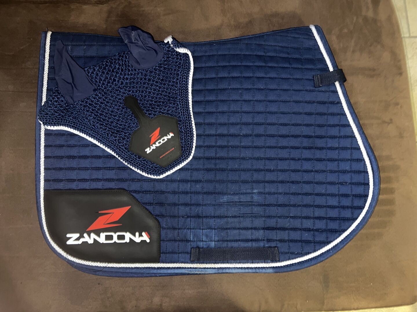 All different types of tack for sale due to not being used anymore: white flyveil(zandona)-40e blue flyveil(harry’s horse)- 40e black flyveil(kavalkade)-15e blue zandona set-100e black zandona set- 110e green set- 70e - everything is size full kentucky tendon boots-140e (size M) girth with sheepskin-130e (135cm and 145cm) zandona body protector- 90e (kid size)