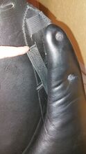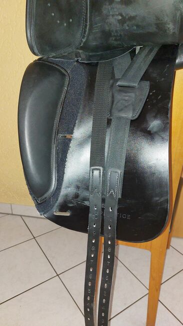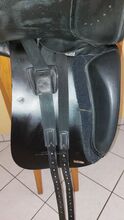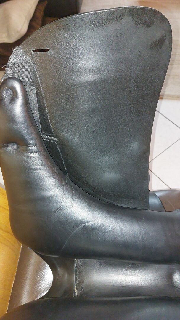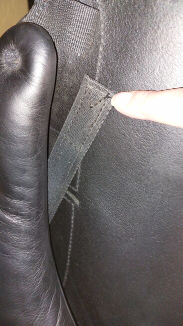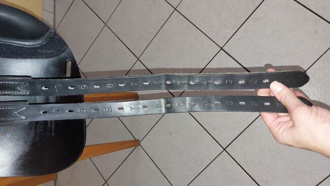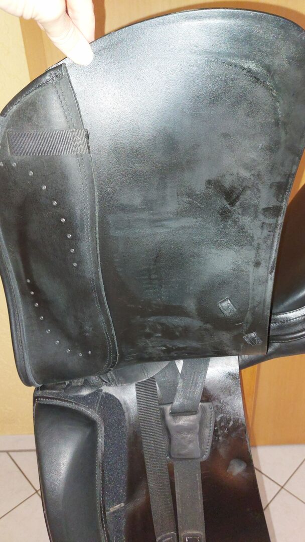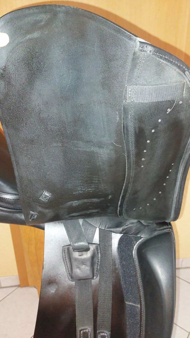 As the saddle's shoulder freedom was no longer sufficient for my horse later on, the saddler fitted a new front girth strap next to the rear strap. This minimized the pressure of the gullet plate on the shoulder and the trapezius muscle. The original gullet plate is still there, however, so that the saddle can be restored to its original condition (see photo).