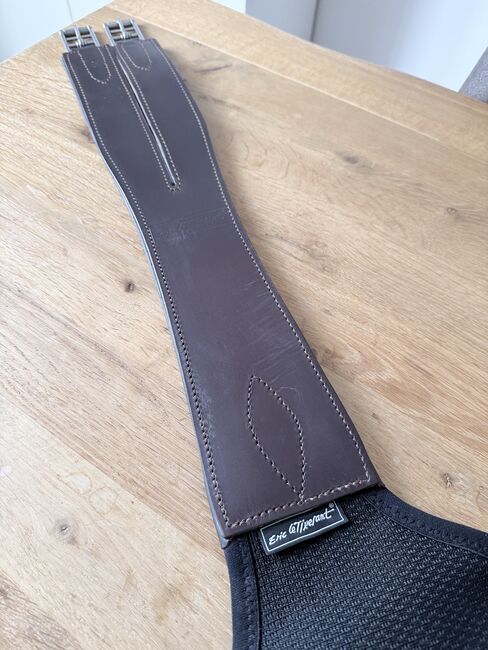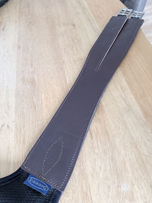 Euroriding saddle girth Eric le Tixerant, long girth brown 140cm - I am selling my Euroriding Eric le Tixerant long girth in 140cm as it no longer fits my gelding. I was very happy with the girth and have therefore bought it again in the length that now fits. My gelding has a slight girth tightening and with this girth this is hardly a problem for him. The pressure is distributed very comfortably thanks to the gel padding on the belly. The girth is used but in very good condition. I would be delighted if it found a new owner.